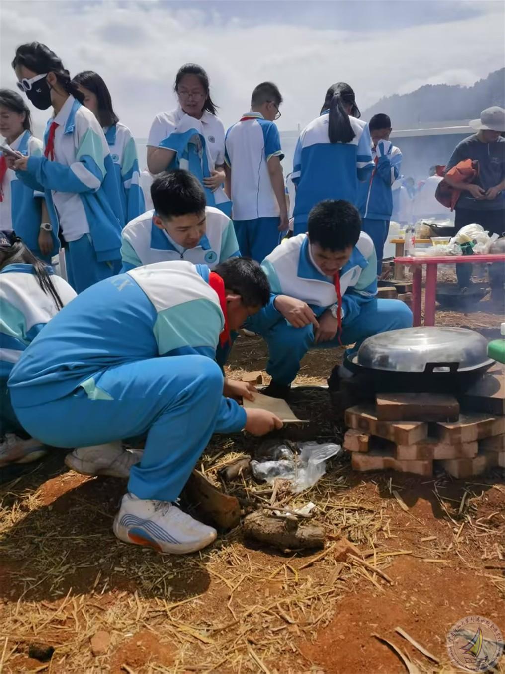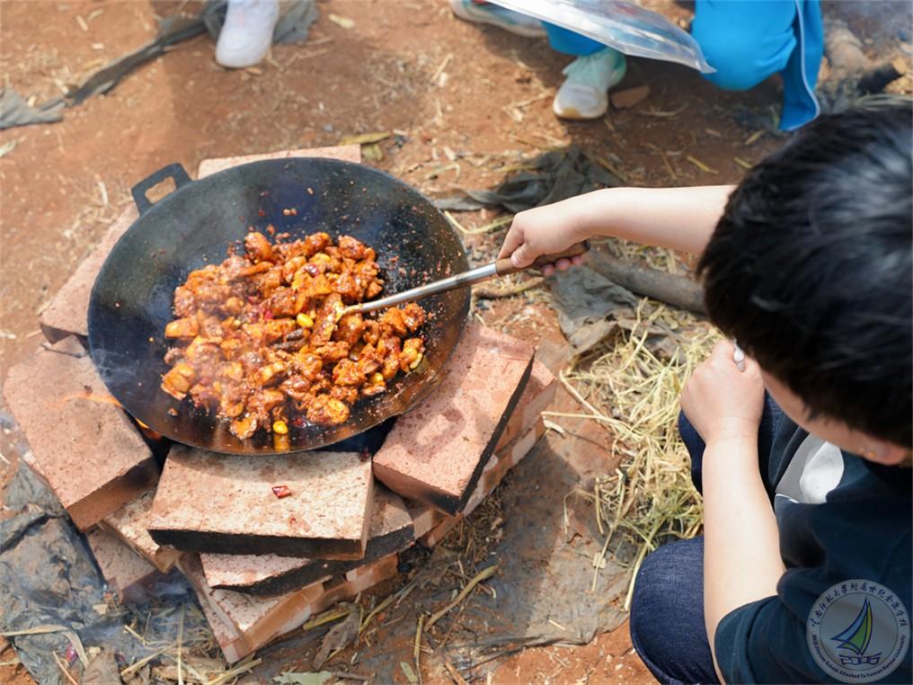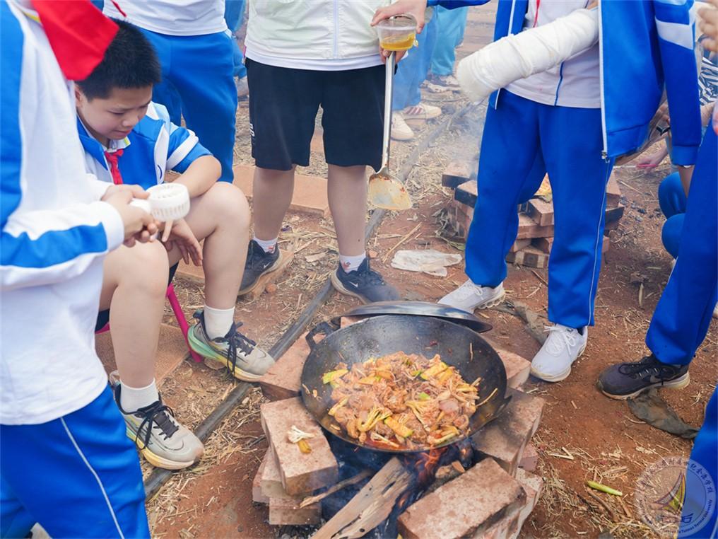 日至中天,烧柴火鸡的环节为研学增添了一抹烟火气息。同学们分工明确,拾柴生火者,点燃希望的火苗;处理食材者,赋予食材新的生机;搅拌翻炒者,在锅碗瓢盆间演绎着劳动的旋律。炊烟袅袅升腾,柴火鸡的浓郁香味弥漫在空气中,那是劳动与协作酝酿出的独特芬芳。同学们在烟火缭绕中体验生活的质朴与美好,学会生活技能的同时,也深刻理解“一粥一饭,当思来之不易”的内涵。