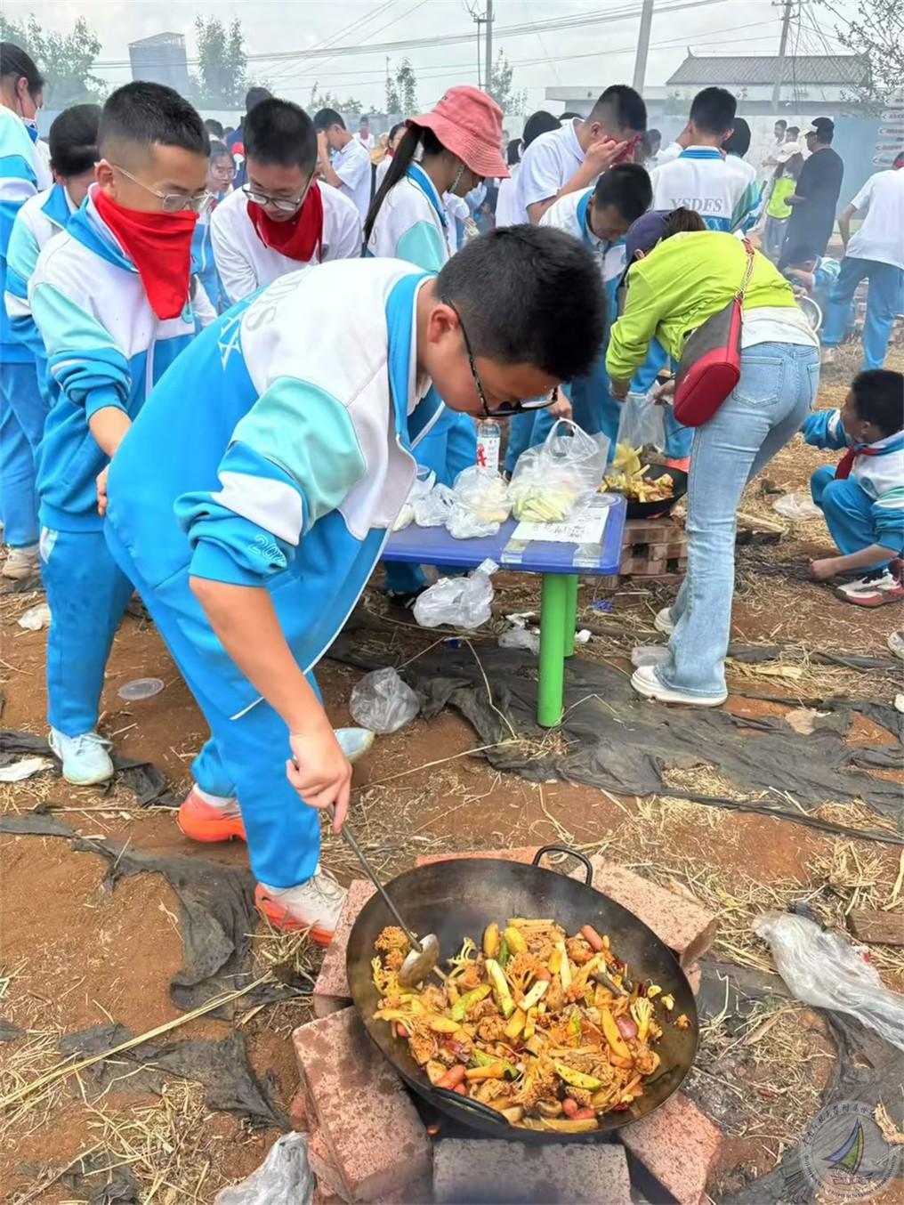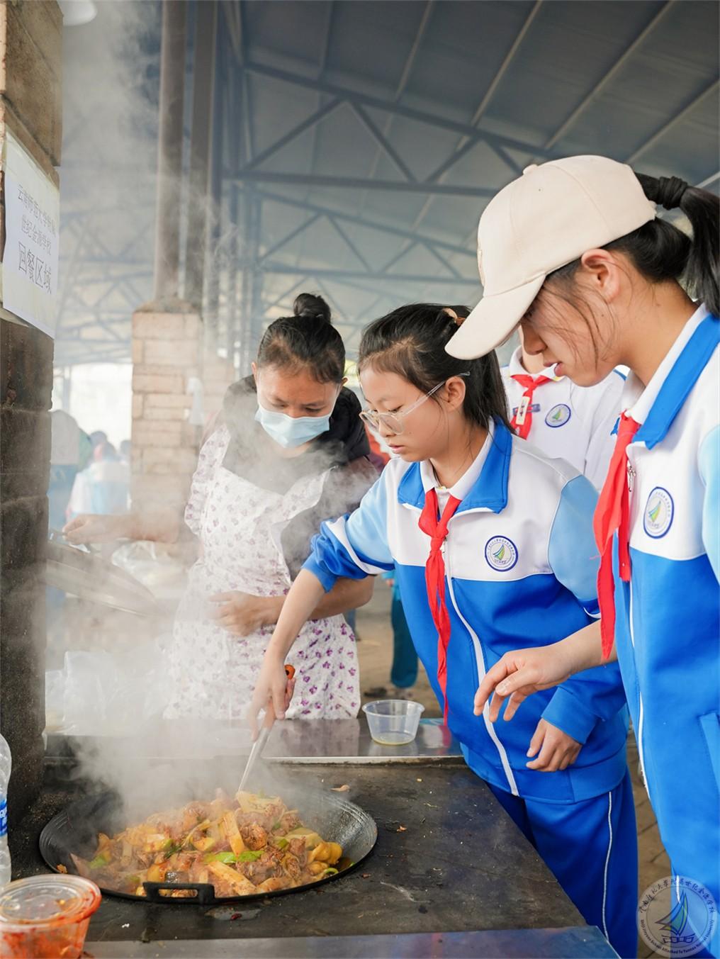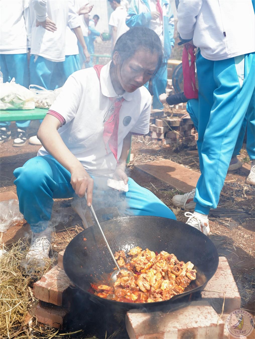 日至中天,烧柴火鸡的环节为研学增添了一抹烟火气息。同学们分工明确,拾柴生火者,点燃希望的火苗;处理食材者,赋予食材新的生机;搅拌翻炒者,在锅碗瓢盆间演绎着劳动的旋律。炊烟袅袅升腾,柴火鸡的浓郁香味弥漫在空气中,那是劳动与协作酝酿出的独特芬芳。同学们在烟火缭绕中体验生活的质朴与美好,学会生活技能的同时,也深刻理解“一粥一饭,当思来之不易”的内涵。