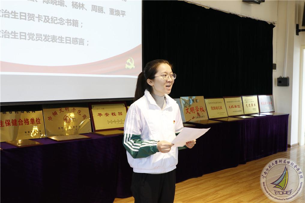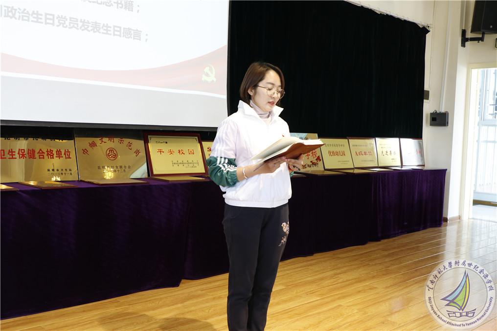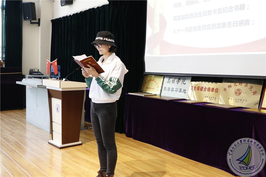 第三项议程,渠志春副校长带领全体党员重温入党誓词。全体党员为何其敏、杨玲玲、周丽君、邹茜、陈晓瑜、杨林、周丽、董焕平八位同志过政治生日,渠志春副校长为她们颁发了政治生日贺卡和纪念书籍,政治生日党员分别发表生日感言。
