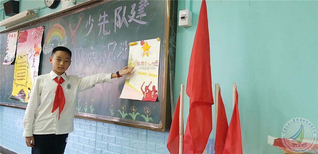 主题班会上,三位旗手精神抖擞地出旗,建队仪式拉开帷幕。神圣的荣誉感从每一位同学心底升腾起来,全场同学肃然起敬,全体少先队员面对队旗庄严立正,行队礼,高唱中国少年先锋队队歌。歌声嘹亮,队旗、红领巾格外鲜艳。活动中,班级优秀少先队员讲述了自己创作的少年先锋队手抄报的象征意义,讲出了全体少先队员的心声和志向。