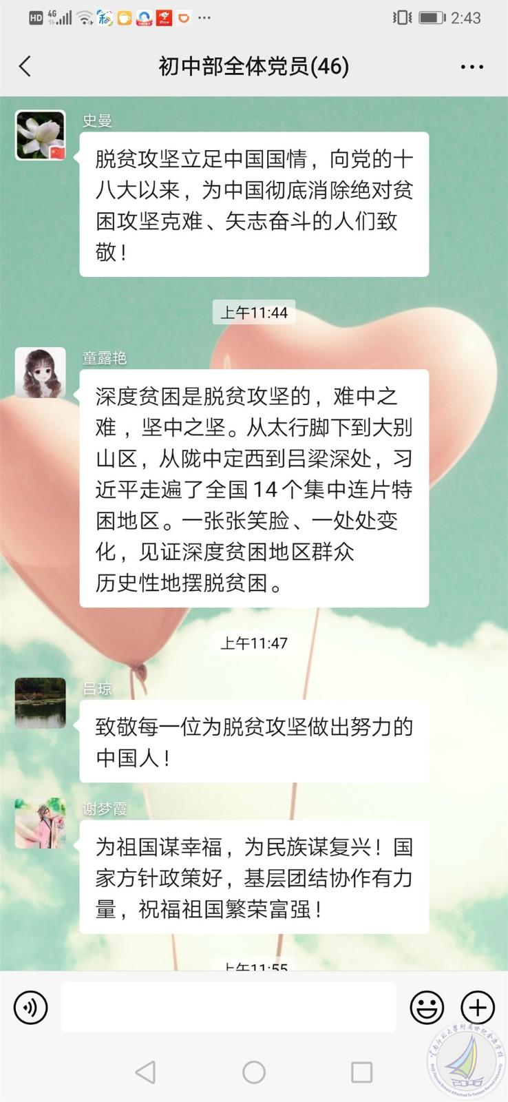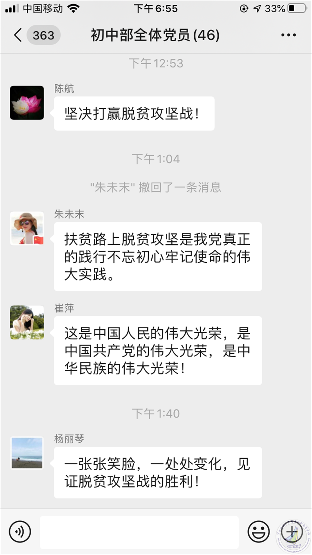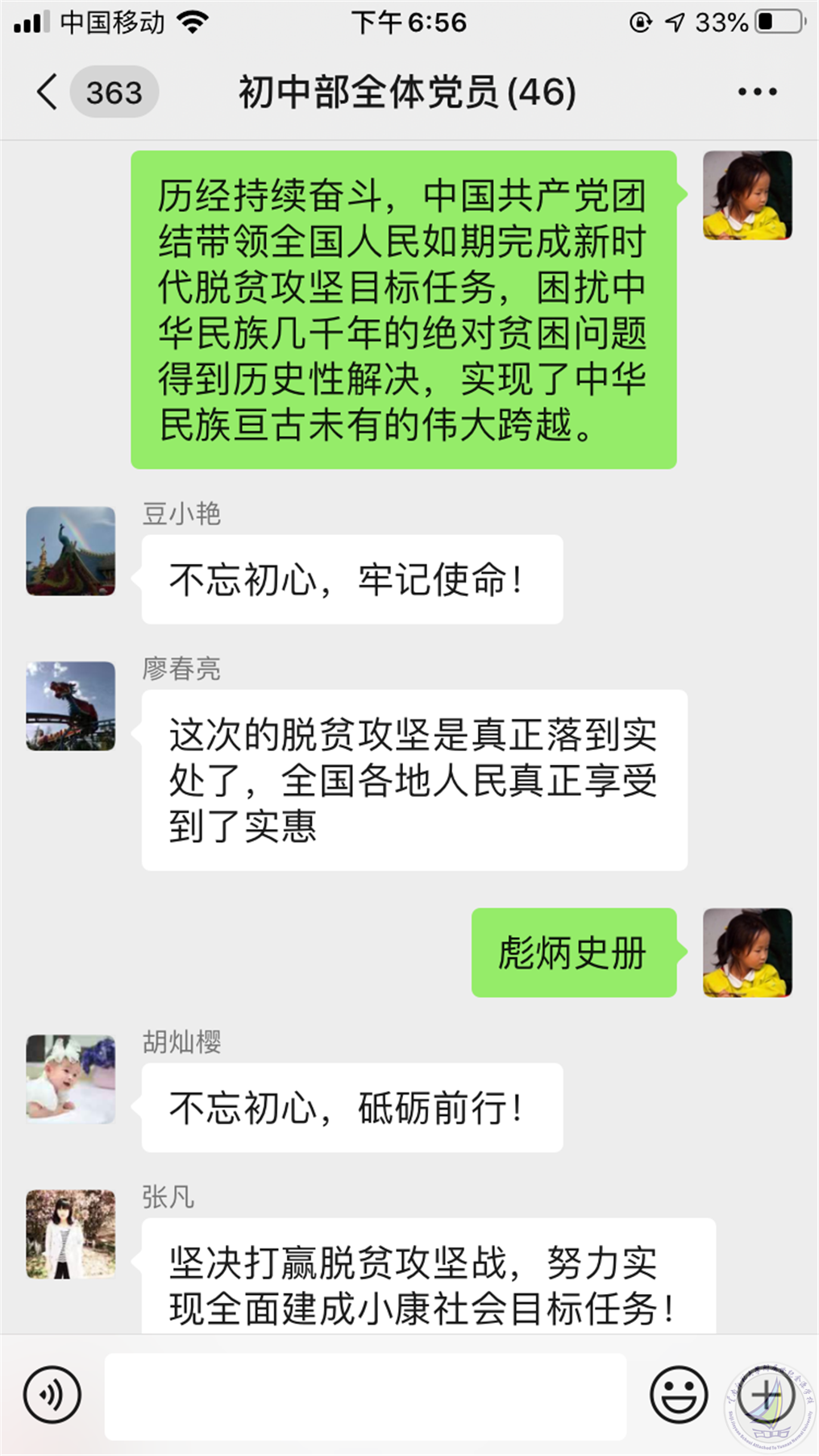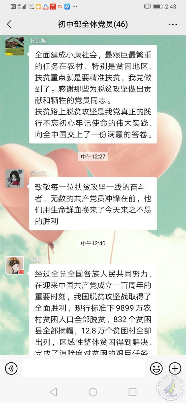 观看结束后,全体党员教师纷纷热议,表示今后将以全国脱贫攻坚楷模、全国脱贫攻坚先进个人、先进集体为榜样,坚守初心、勇挑重担,无私奉献、攻坚克难,以苦干实干的业绩践行共产党人的初心和使命;以永不懈怠的精神状态、一往无前的奋斗姿态,真抓实干、埋头苦干,向着实现第二个百年奋斗目标奋勇前进!