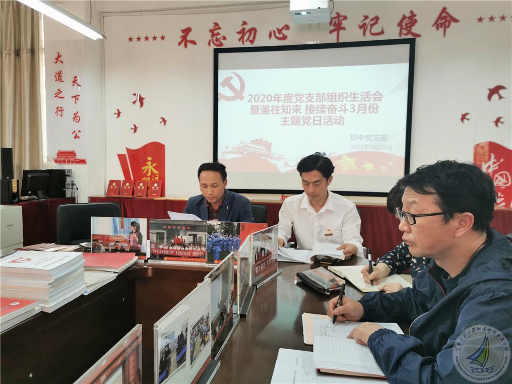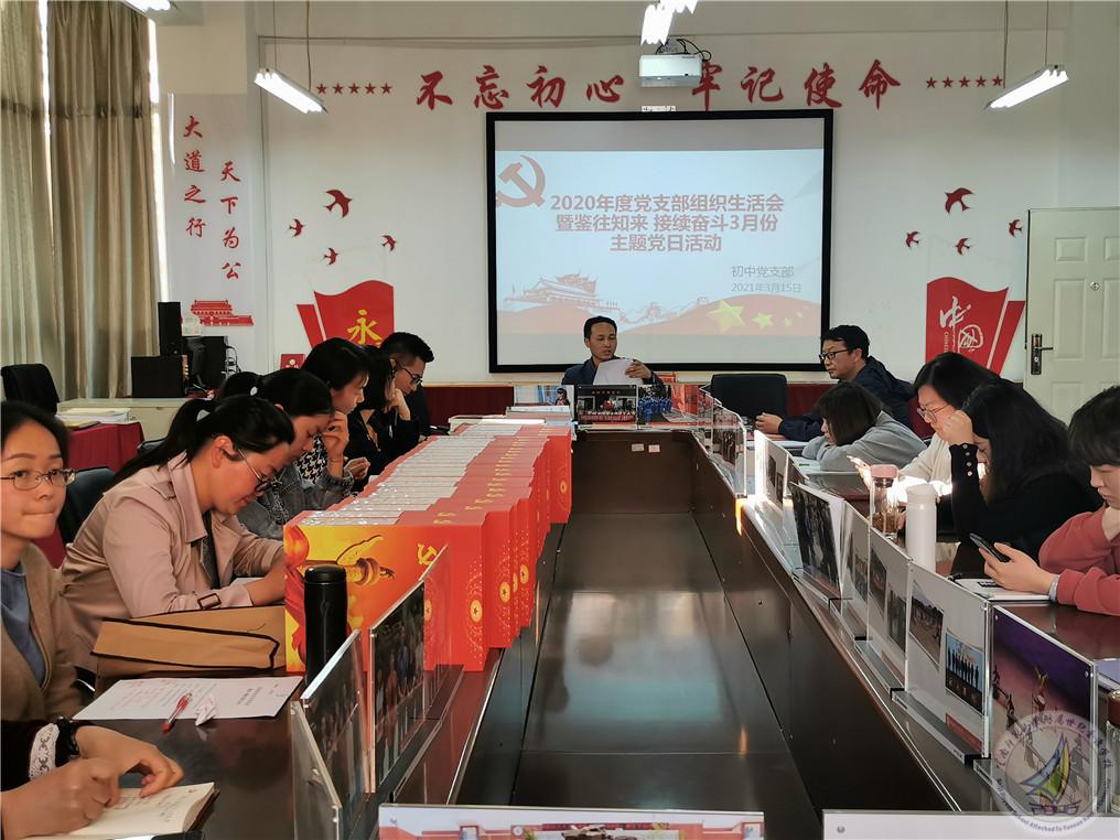 根据学校党委的统一安排部署,2021年3月15日,初中党支部开展了以“2020年度党支部组织生活会暨鉴往知来 接续奋斗”为主题的三月份主题党日活动。学校鲍学良副校长深入支部参与活动,活动由初中党支部书记蔡国平同志主持,支部全体党员、预备党员参与本次活动。