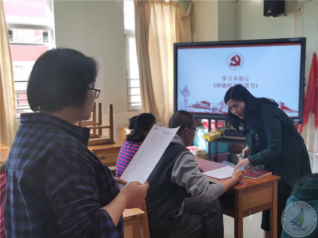 民主评议结束后,由第三党小组组长高敏同志宣读《师德师风承诺书》、胡蝉同志宣读《党员不得信仰宗教承诺书》、支部组织委员下发《教职工信教排查表》,全体党员同志签订并将其中一份交由支部,另一份自己保管。