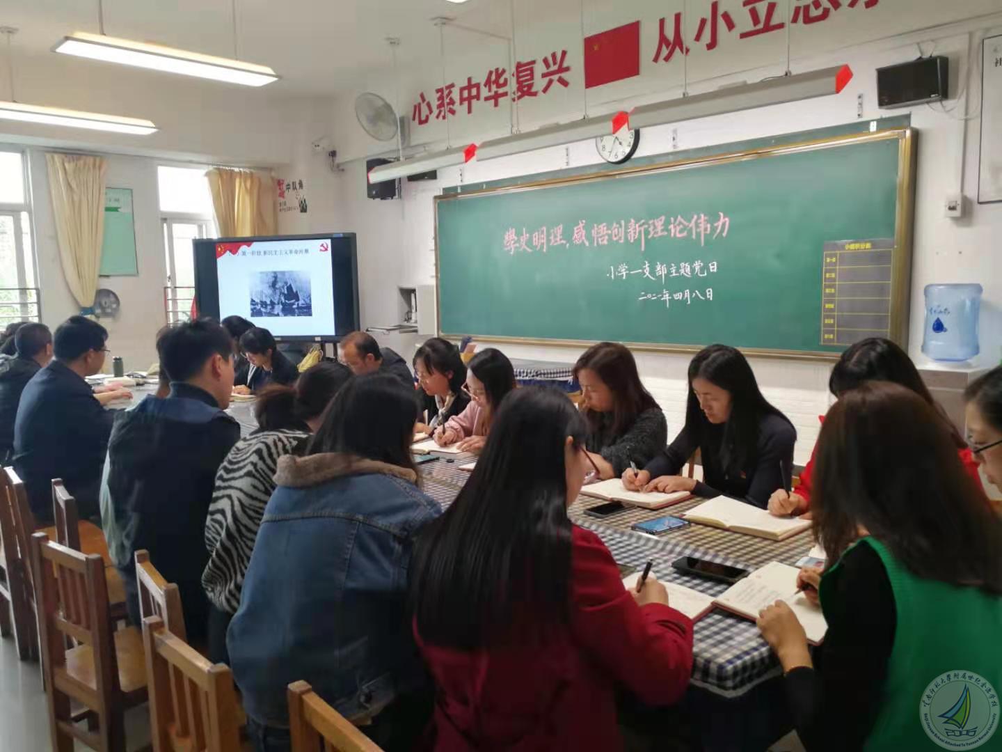 2021年4月8日下午16:30,小学段第一党支部全体党员集中在四年级(1)班教室,开展了“学史明理,感悟创新理论伟力”