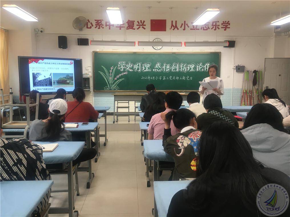 2021年4月8日下午4时半,小学第三党支部全体党员在三年级(3)班教室开展四月主题党日活动。活动主题是“学史明理,感悟创新理论伟力”。学校崔汝坤副校长亲临会议,会议由支部书记梁珈同志主持,全体党员参与。