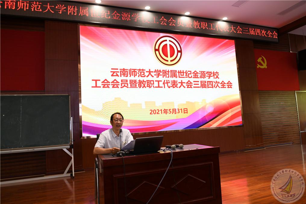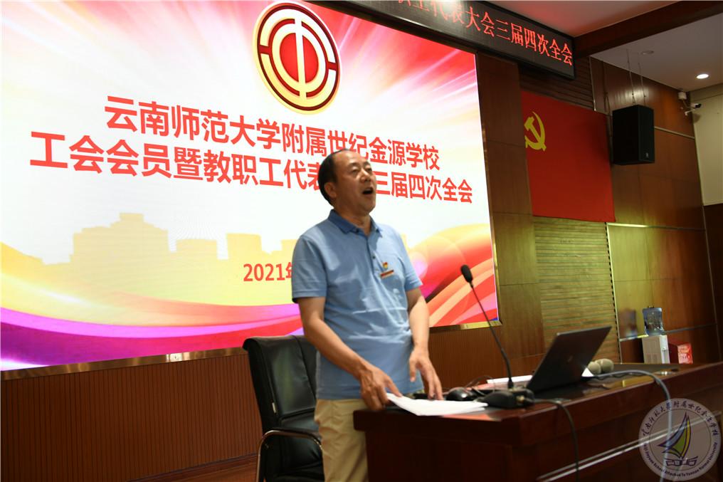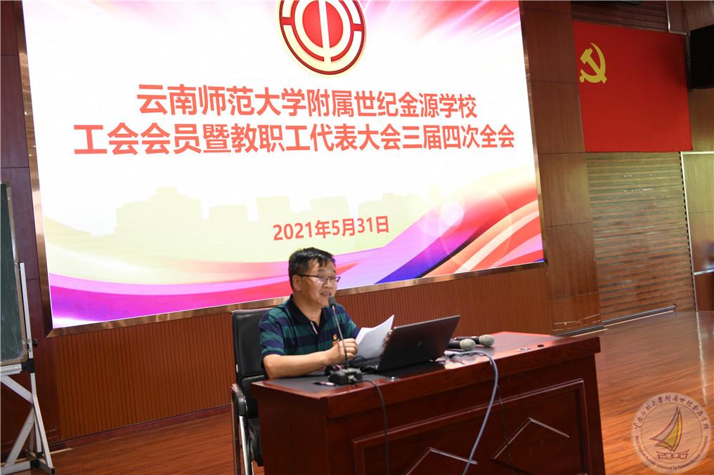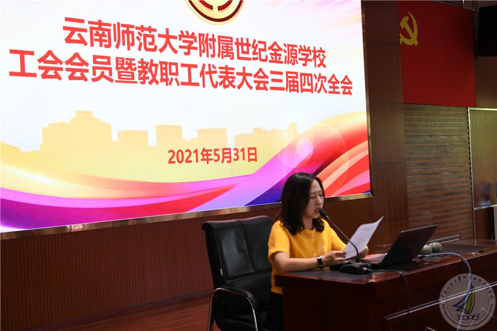 云南师范大学附属世纪金源学校工会会员暨教职工代表大会三届四次全会于2021年5月31日胜利召开,大会应到代表80人,因事因病请假4人,实际到会代表76人,符合法定人数。