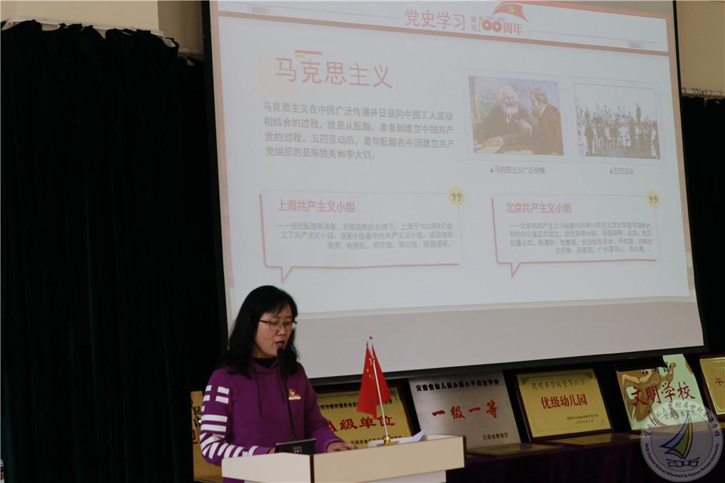 第二项议程,副校长渠志春同志以《百年恰是风华正茂》为主题开展专题党课宣讲活动。从党课中我们深刻感受到,前进的道路上,作为党员教师,必须不忘初心和使命,征途漫漫奋斗不息,历尽艰辛矢志不渝,为幼教事业奉献自己的力量。