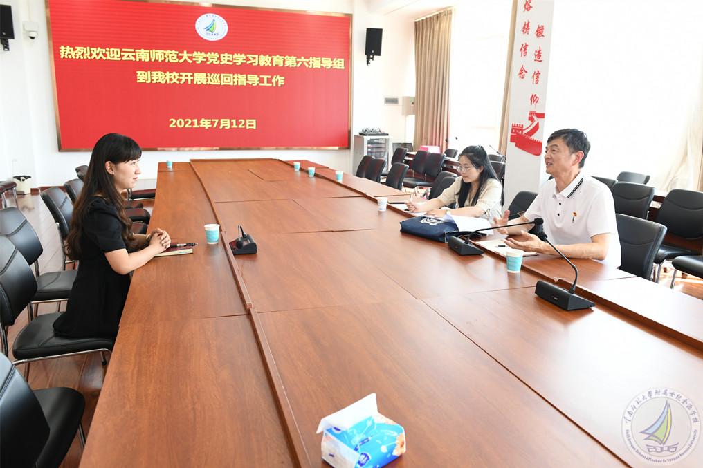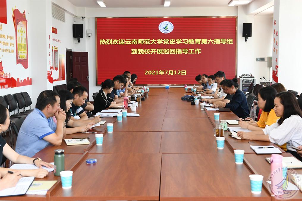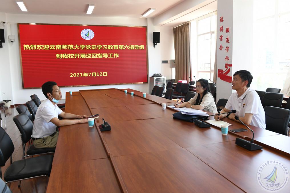 2021年7月12日下午,云南师范大学党史学习教育第六指导组组长马煜、副组长向泰、组员王欢、罗小雅一行4人到我校开展党史学习教育第一轮巡回指导工作。巡回指导组采取听取汇报、座谈交流、个别访谈、查阅资料、随机抽查等方式开展巡回指导工作。学校党委书记、校长马永文向指导组汇报了党史学习教育开展情况。