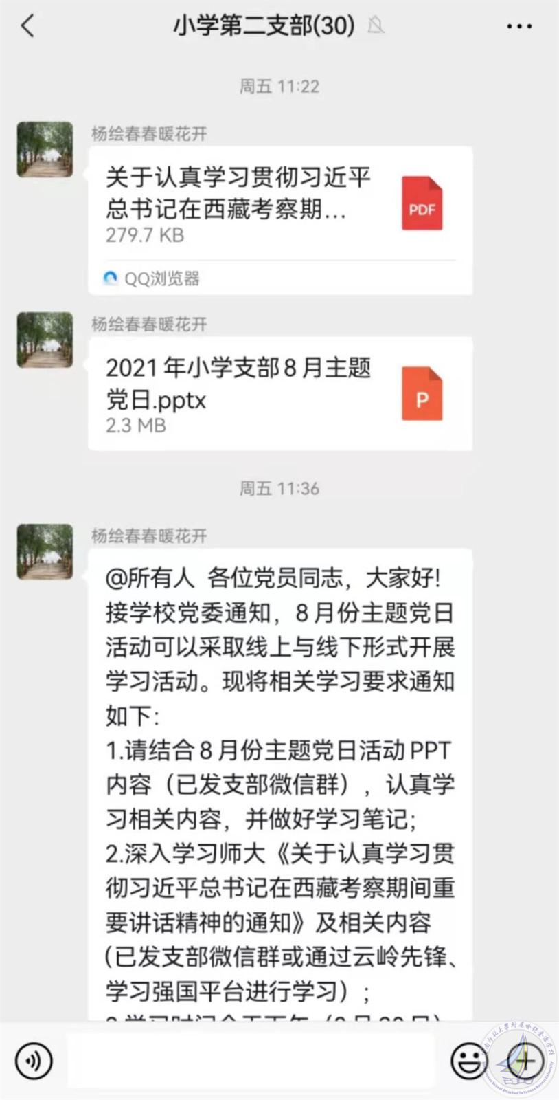 小学段第二党支部于8月20日下午2:00开展了八月主题党日线上学习活动,会议由支部书记杨绘春同志主持。根据上级党委要求,全体党员认真学习了相关内容。其中主要学习了以下文件内容: