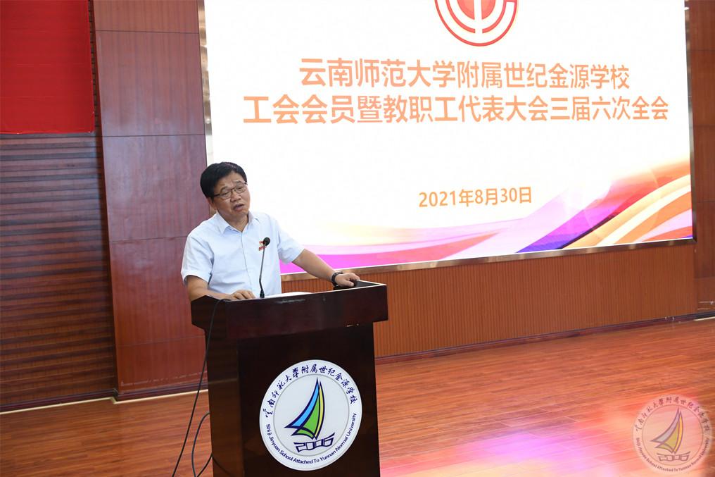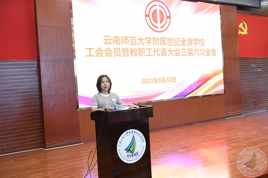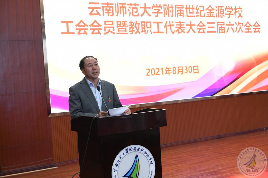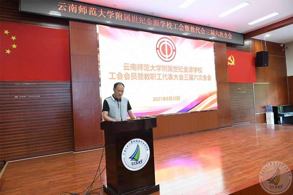 会议由工会主席许全友同志主持。会议听取了学校行政办公室副主任王杰同志对《云南师范大学附属世纪金源学校教职工履职考核实施办法量化评分细则》相关修订条款的情况说明;听取了党委书记、校长马永文同志对学校申报“云南省现代教育示范幼儿园”“云南省一级三等完全中学”“云南省现代教育示范小学”有关工作进展情况的说明。经过全体代表的审议,会议通过了《云南师范大学附属世纪金源学校教职工履职考核实施办法量化评分细则》相关修订条款的制度文件。