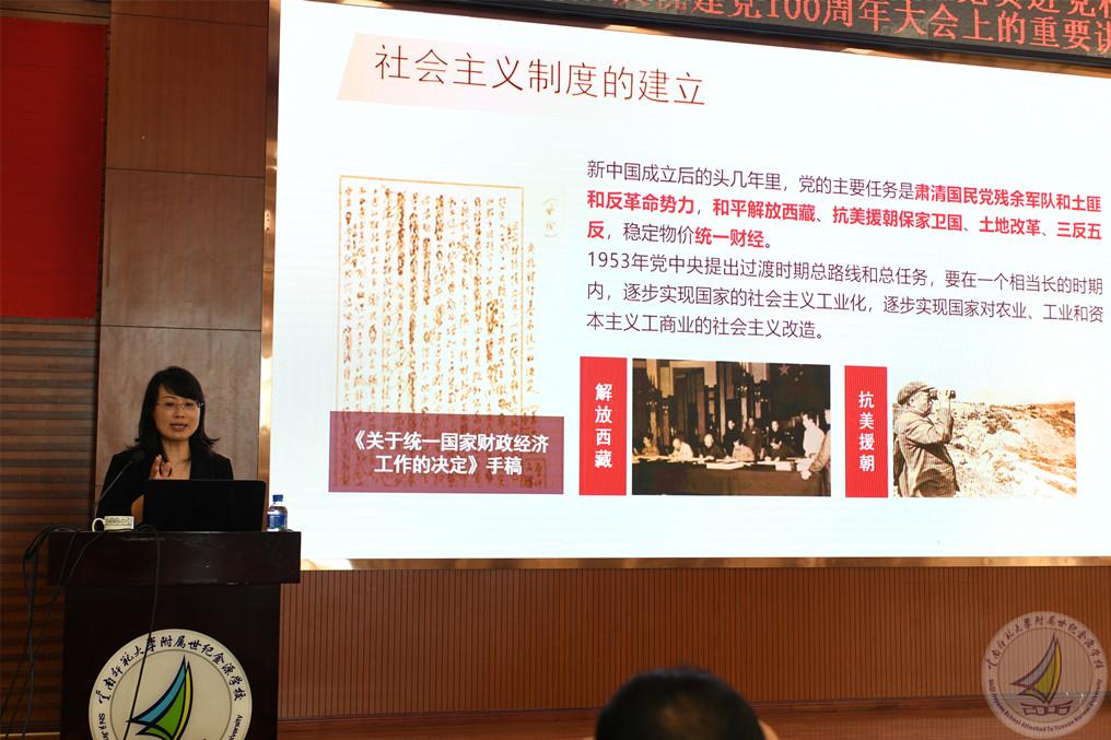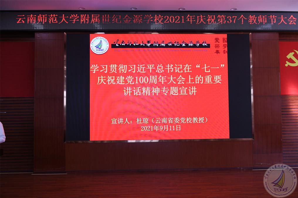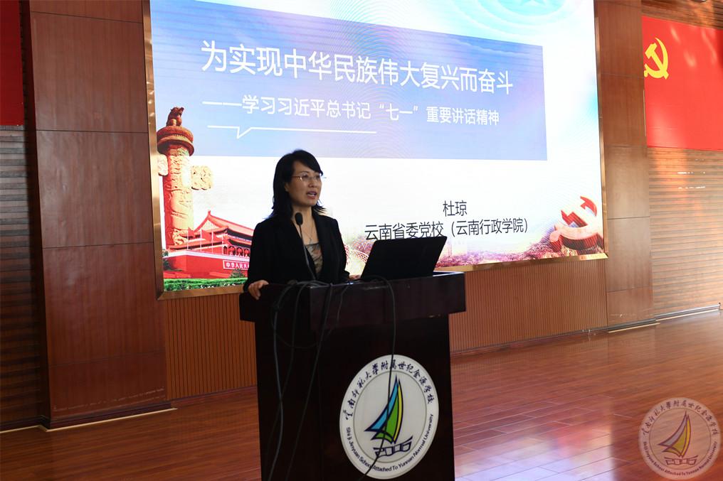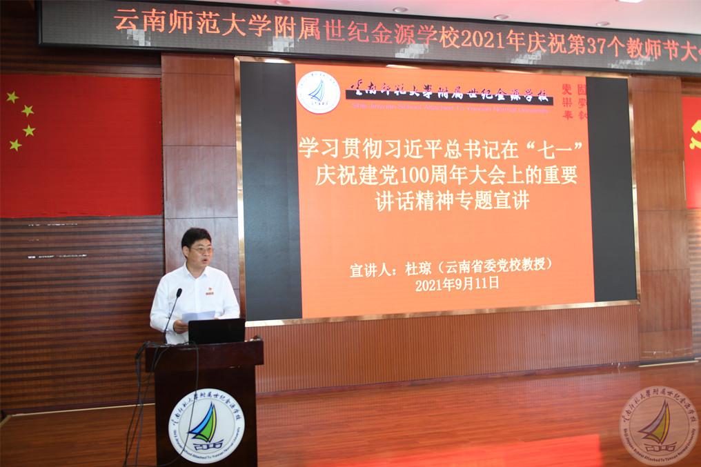 根据《中共云南师范大学委员会关于认真学习贯彻习近平总书记在庆祝建党100周年大会上的讲话的通知》(云师大党通〔2021〕50号)和《关于做好学习贯彻习近平总书记在庆祝中国共产党成立100周年大会上的重要讲话精神专题宣讲工作的通知》(云师大学组〔2021〕8号)要求,学校邀请云南省委党校、云南行政学院杜琼教授为全校教职工开展了学习贯彻习近平总书记在庆祝中国共产党成立100周年大会上的重要讲话精神专题宣讲,并为全体党员开展了“万名党员进党校”集中培训。