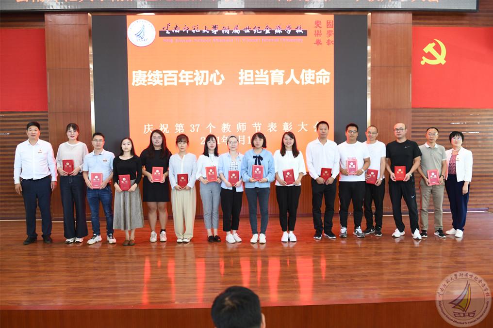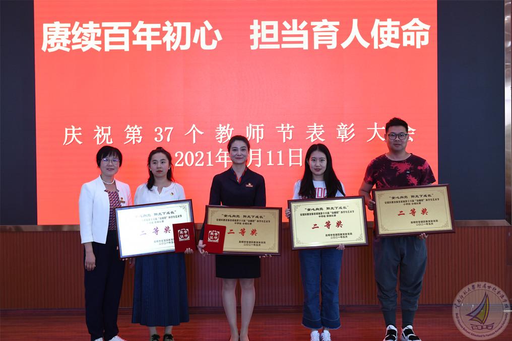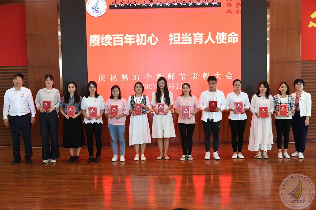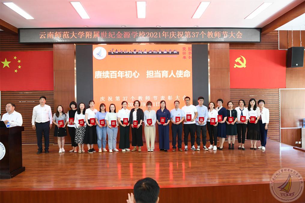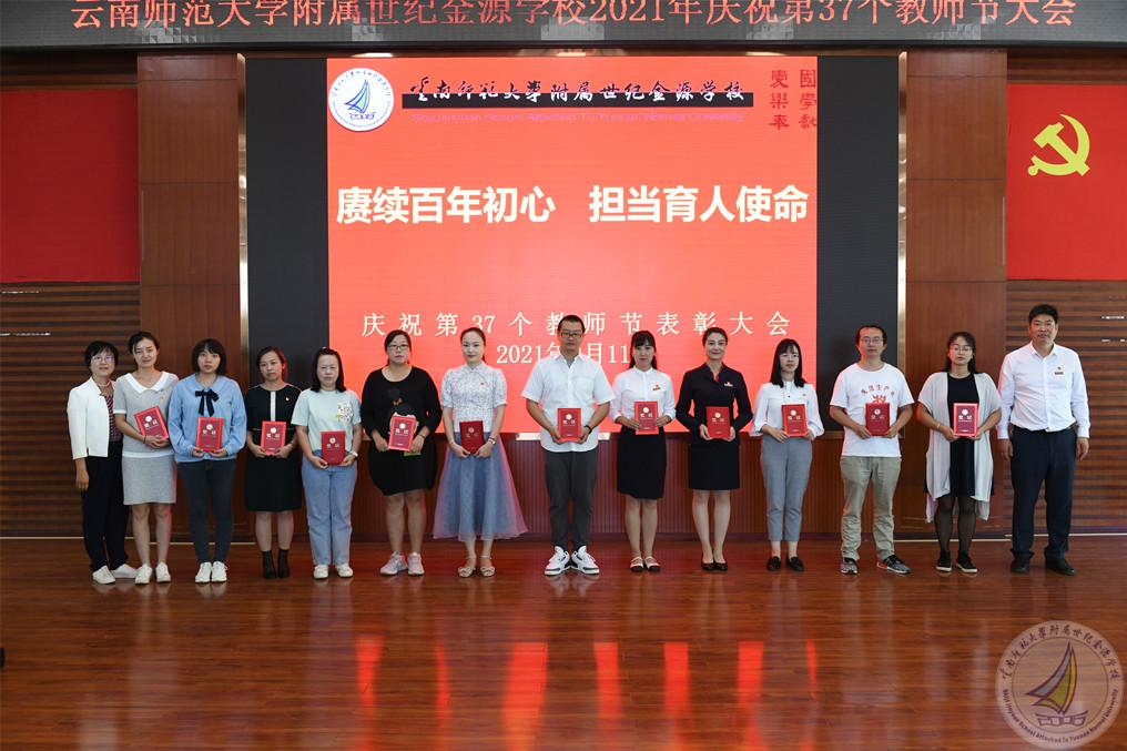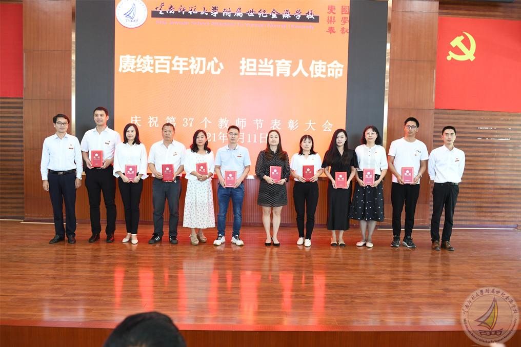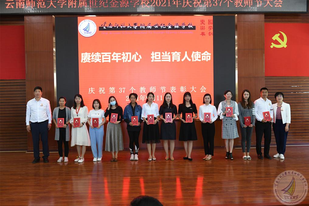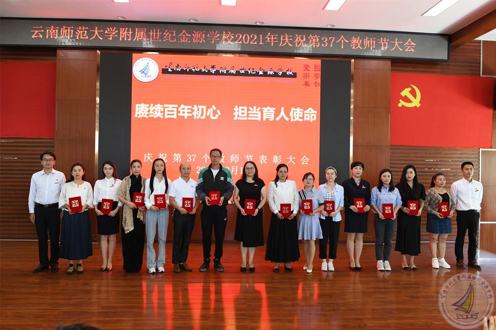 许全友副书记在大会上宣读了获得参加迪庆州脱贫攻坚人才支持专项工作表彰优秀教师名单、2020—2021学年云南师范大学基础教育集团表彰的优秀教师和优秀教育工作者名单、学校2020—2021学年年度履职考核中表彰的优秀教师和优秀教育工作者名单、2020—2021学年各级各类课堂教学竞赛中获奖教师名单、各级各类体育艺术比赛中获奖的教师名单。大会对获奖教师进行了隆重表彰,学校领导为他们颁发了荣誉称证书。