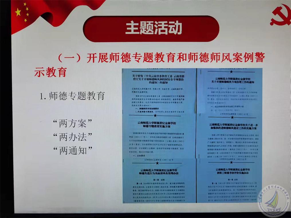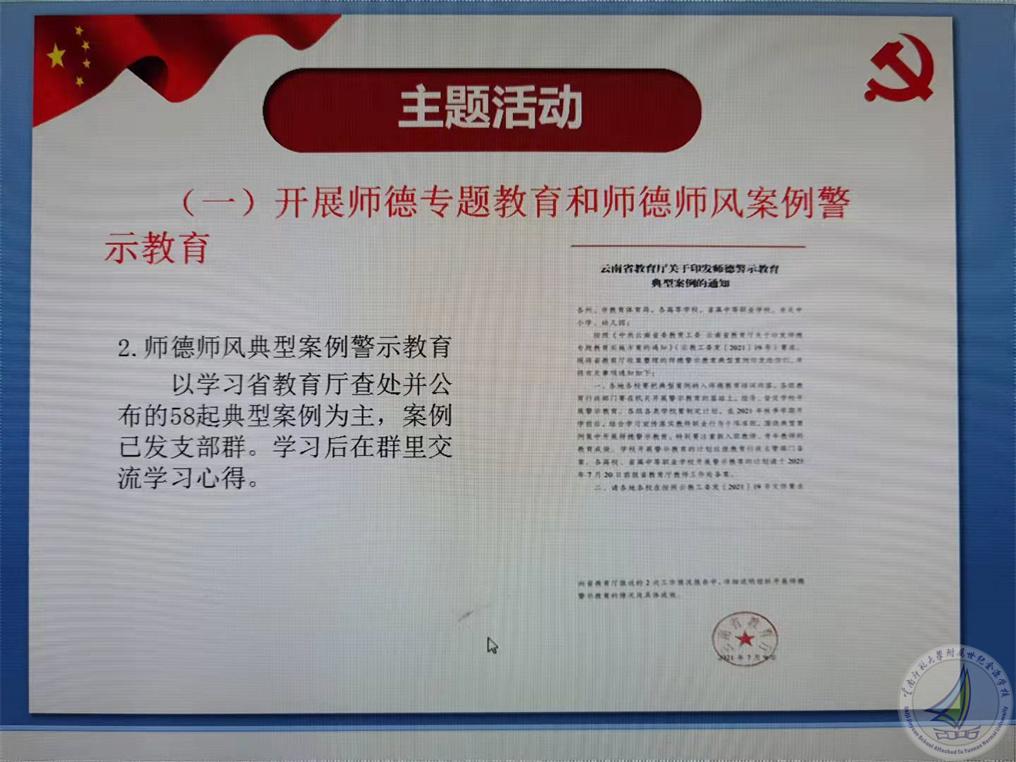 在支部书记杨绘春同志的带领下,全体党员认真学习了学校党委下发的关于师德专题教育的“两方案”、“两办法” 、“两通知”等内容。还学习了师德师风典型案例警示教育,以学习省教育厅查处并公布的58起典型案例为主。全体党员积极讨论,并交流学习心得体会。