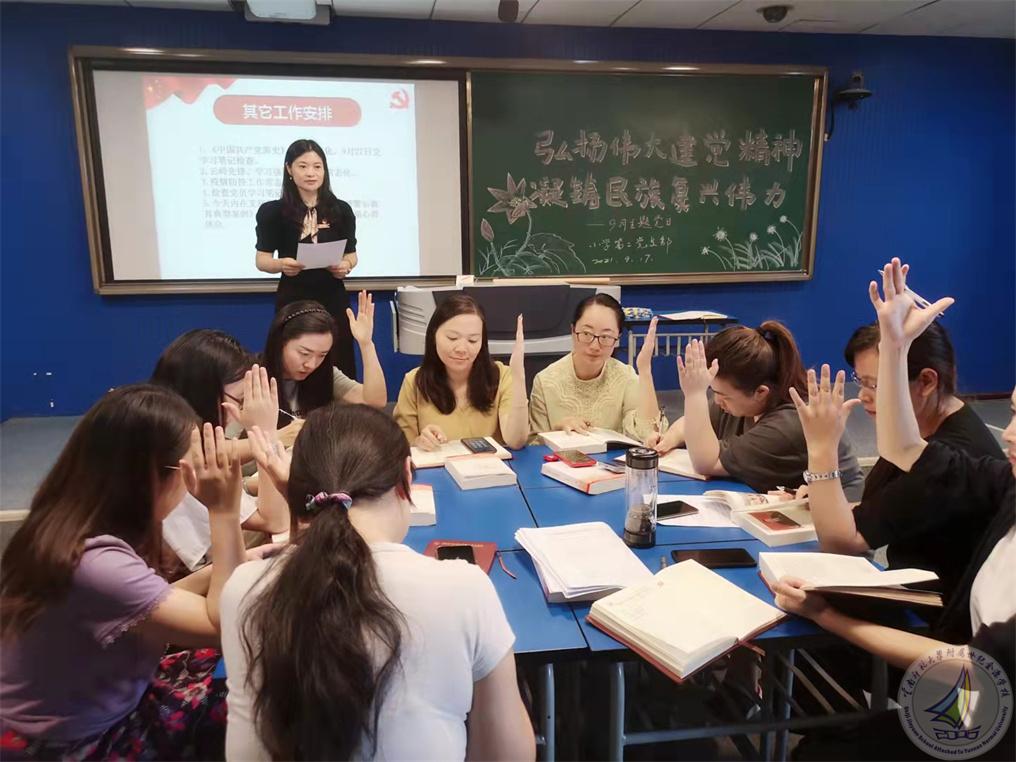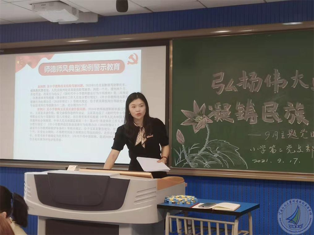 2021年9月17日中午12:30,小学段第二党支部全体党员在小学四楼多媒体教室开展九月份主题党日活动。此次活动主题为“弘扬伟大建党精神 凝铸民族复兴伟力”,会议由支部书记杨绘春同志主持。会议分为六个议程: