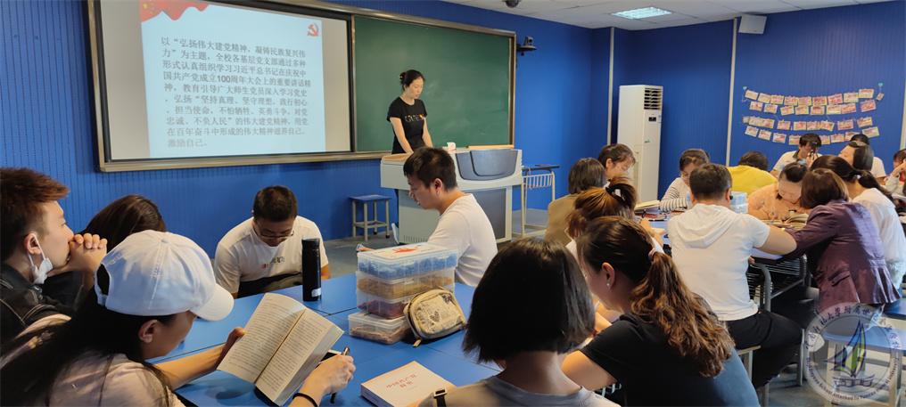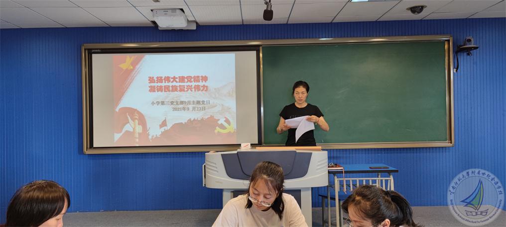 2021年9月23日上午9时5分,小学第三党支部全体党员在四楼会议室开展九月主题党日活动。活动主题是“弘扬伟大建党精神, 凝铸民族复兴伟力”。副校长崔汝坤同志亲临会议,会议由支部书记梁珈同志主持,全体党员参与。