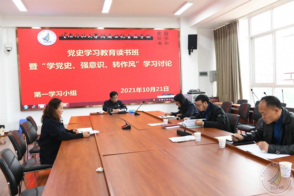 根据学校党委制定的《云南师范大学附属世纪金源学校关于开展党史学习教育读书班暨“学党史、强意识、转作风”学习讨论的通知》《云南师范大学附属世纪金源学校关于对开展党史学习教育读书班暨“学党史、强意识、 转作风”分组学习讨论的安排》等文件要求,学校全体中层干部和支部书记分为6个小组,围绕“强化政治意识、法纪意识、服务意识,弘扬学习之风、调研之风、实干之风”主题开展了分组学习讨论和交流发言,撰写了学习自查报告和发言提纲,分析了学习中存在的问题,并结合工作实际提出了整改方向和整改措施。分管校领导参与分组学习讨论活动,并对学习讨论情况进行了指导。