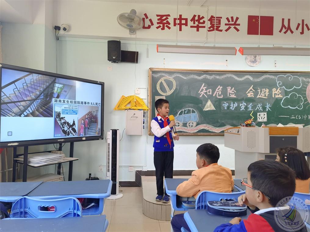 11月15日上午9点钟,少先队大队部在广播室组织召开“知危险 会避险 守护安全成长”主题晨会活动。大队委张轩铭同学倡议所有同学:1.绝不随意闯红灯,穿马路。2.绝不在公路上追逐、打闹、并排走。3.绝不逞能“骑快车”骑“英雄车”。4.乘坐公共汽车、电车或长途汽车,须在站台或指定地点依次候车。5.树立自我安全意识 要时时想安全,事事讲安全。6.提高个人思想素质,团结同学,和睦相处,严禁打架、骂人,争做文明小学生。7.关注课间安全。课间不做剧烈运动,避免发生各种伤害。上下楼梯靠右走,做到右行礼让。不追逐嬉戏、不打闹、不拥挤、不爬窗、不高空抛物、不带尖锐物品进校。8.要注意食品卫生安全,不食用三无小食品,不乱吃零食 不喝生水。最后让我们携起手来共同勉励,共同呵护。让我们的世界少一点悲哀,多一份欢乐。让生命之花在爱心和责任中成长!