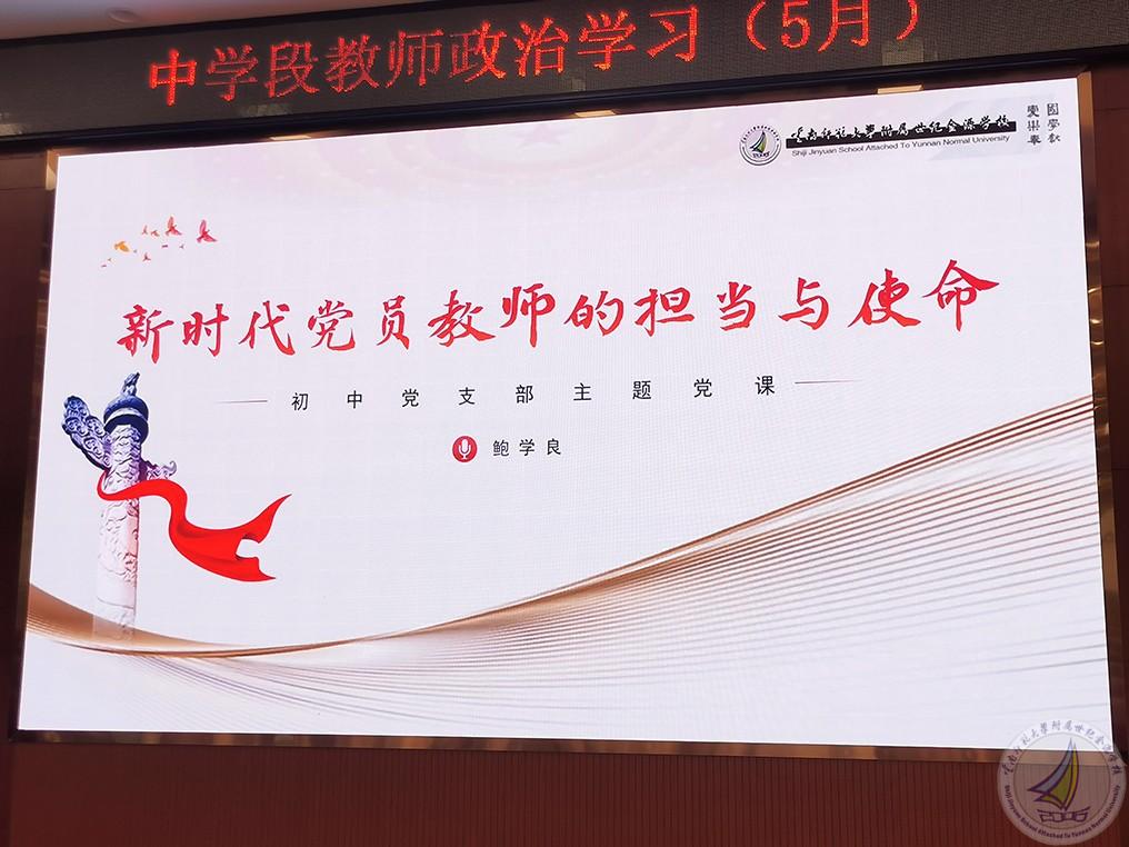 新时代呼唤新担当,新担当促进新作为,新作为造就新时代。为进一步帮助党员教师理解新时代赋予的新担当与新使命,坚定理想信念,提升政治素养,激发工作热情,5月23日下午,初中党支部邀请鲍学良副校长为全体党员做主题为《新时代党员教师的担当与使命》的专题党课。初中党支部全体党员聆听了党课。