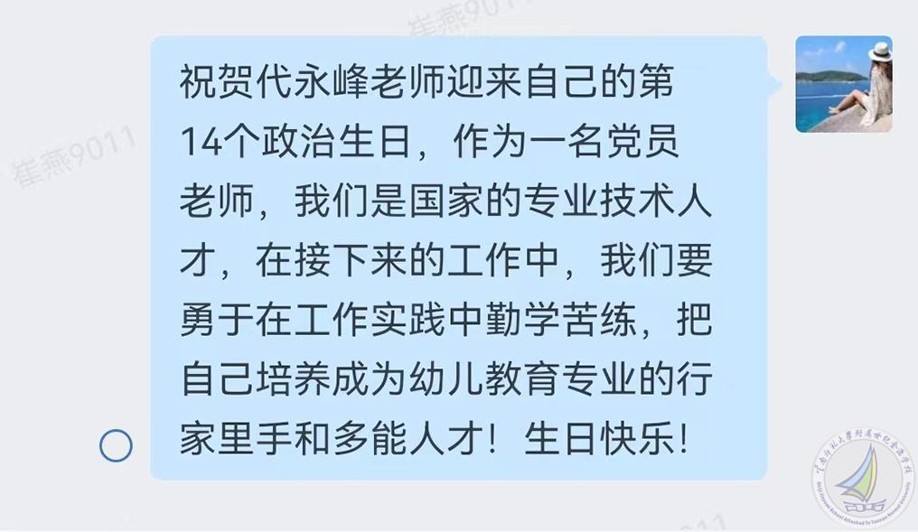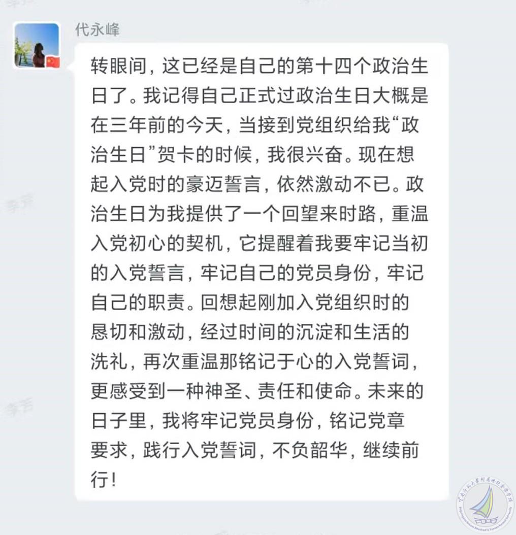 第二项议程,全体党员为代永峰同志过政治生日。代永峰同志发表政治感言,与全体党员共同分享自己政治生日的激动心情。党支部书记崔燕同志也代表支部对代永峰同志提出要求:要勇于在工作实践中勤学苦练,把自己培养成为幼儿教育专业的行家里手和多能人才。
