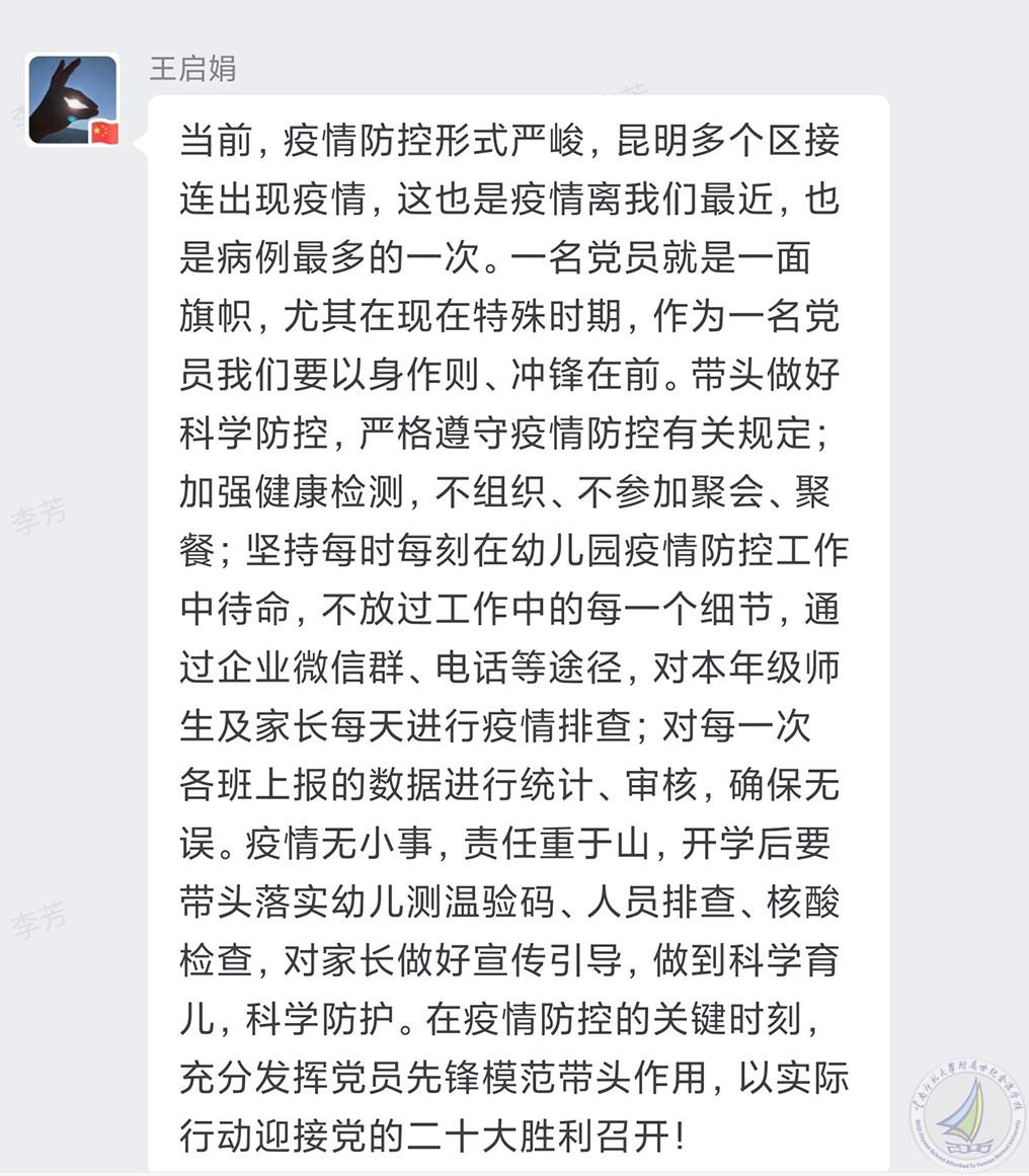 第三项议程,党员同志分享学习心得感悟。全体党员针对八月份组织生活学习材料,结合自己的工作实际,在即将迎来的新学期,在疫情防控工作的关键时期,怎样在各自的工作岗位切实发挥党员的先锋模范带头作用,以实际行动迎接党的二十大胜利召开,书写心得感悟,配上学习图片,在幼儿园党员群内分享交流。