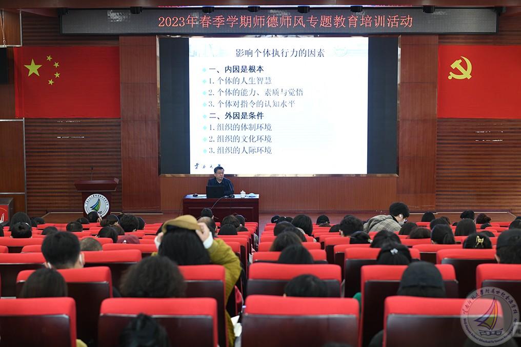 新学期开学,是对教职工的思想和工作进行“补钙”和“充电”的好时机。2月11日上午,学校召开了新学期教职工政治理论学习和“万名党员进党校”培训大会,邀请云南大学政府管理学院院长、法学博士、政治学博士后、博士导师方盛举老师作了题为《作为人生智慧的执行力》专题讲座。会议由党委书记、校长王英同志主持。