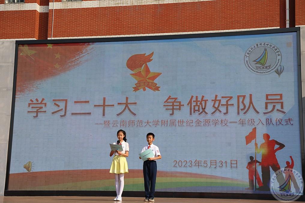 在全国迈向全面建设社会主义现代化国家新征程、向第二个百年奋斗目标进军的关键时刻,党的二十大为我们接下来的五年提出了纲领性的要求,发出了铿锵有力的号召,这是对全党全社会的要求,更是对全体少先队员的要求。为全面学习贯彻党的二十大精神,同时为祖国培养社会主义建设者和接班人,少先队大队部于5月31日上午9时在学校操场举行主题为“学习二十大 争做好队员”暨云南师范大学附属世纪金源学校一年级入队仪式。此次活动有幸邀请到师大基础教育集团主任王朝训同志、学校党委书记、校长王英同志、学校党委副书记许全友同志、以及学校副校长崔汝坤、渠志春、简文武等同志,出席仪式的还有各中心、各处室负责人以及一年级全体师生。在入队仪式开始之前少先队礼仪队为莅临此次活动的领导嘉宾送上少先队最崇高的礼仪---佩戴红领巾。