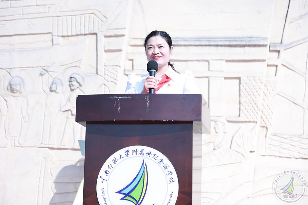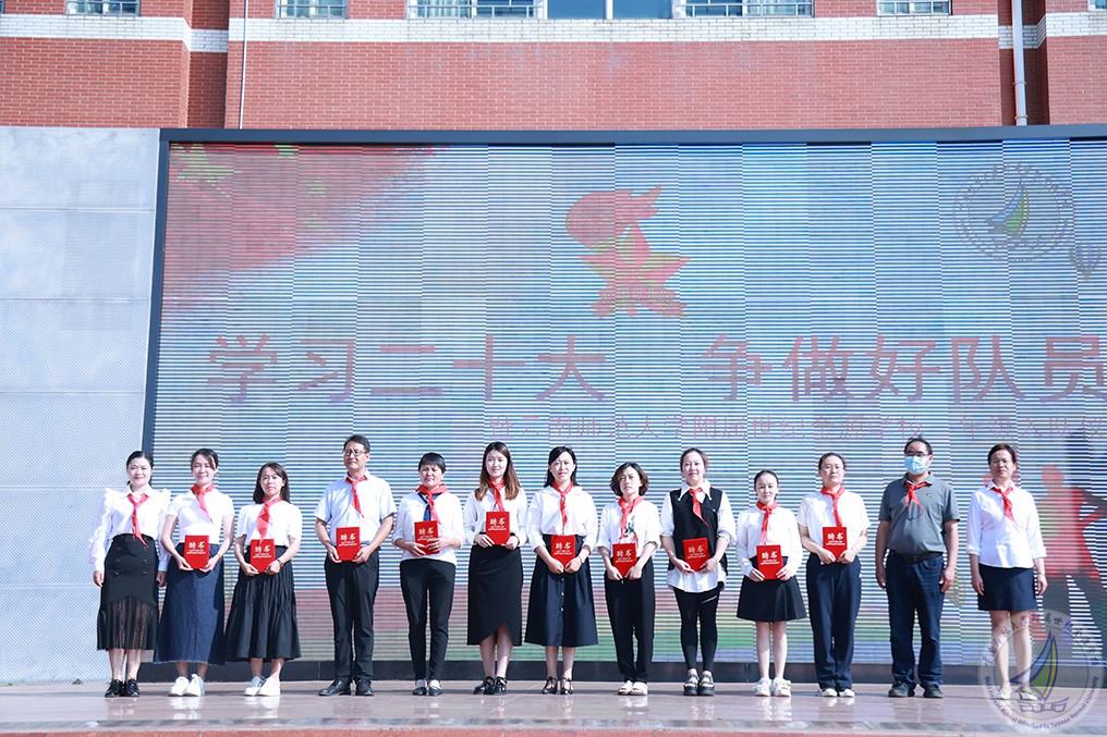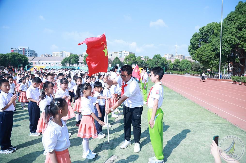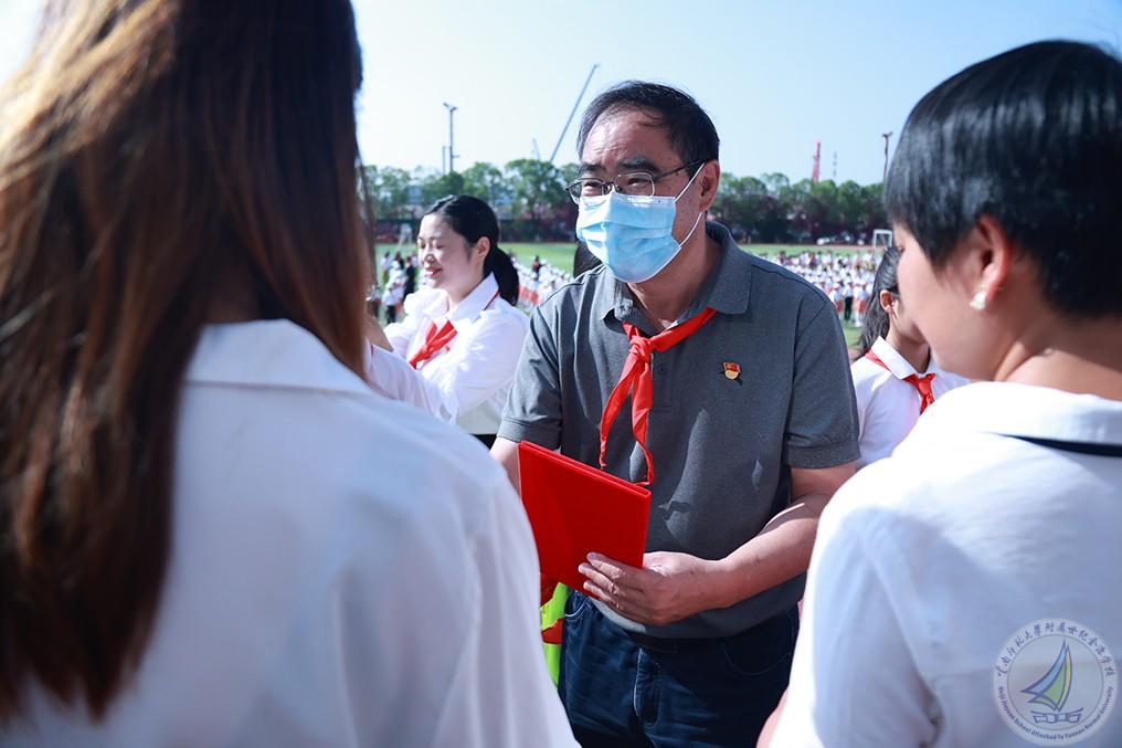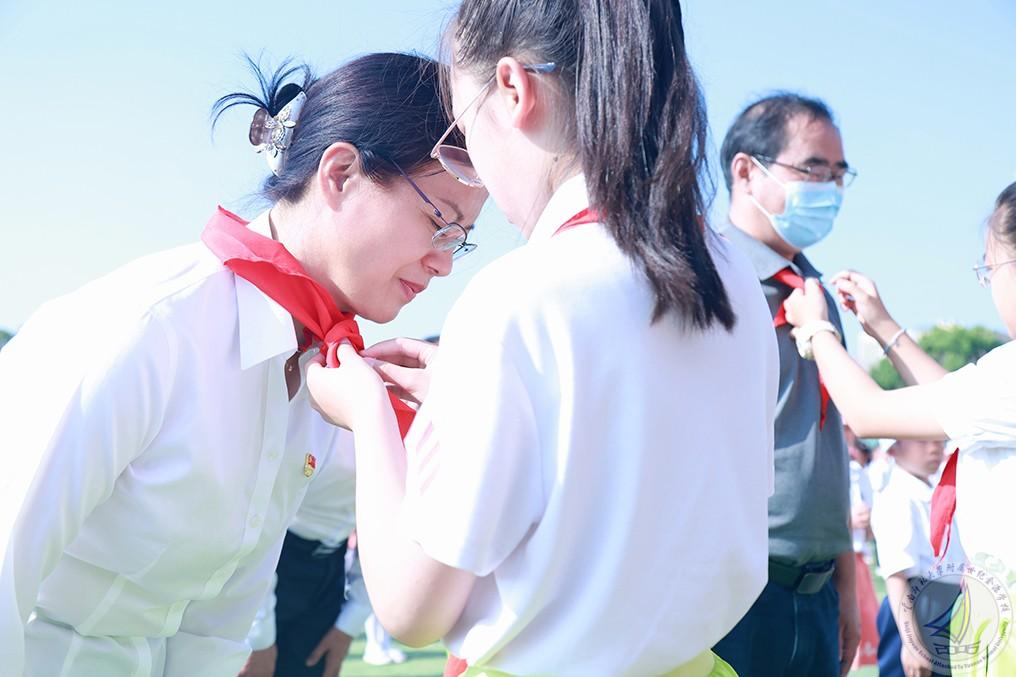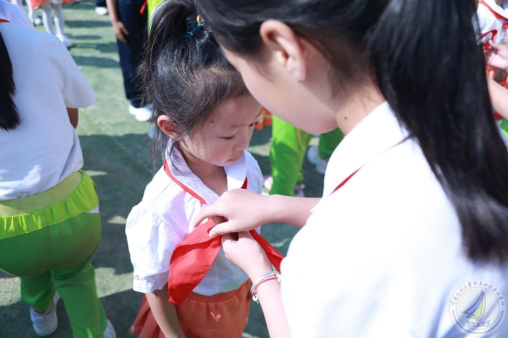 接下来由师大基教集团主任王朝训同志和学校党委书记、校长王英同志一起为一年级辅导员颁发聘书。随后少先队副总辅导员宋思远老师为一年级各中队授旗;授旗后五年级少先队员代表为一年级入队的180名同学佩戴鲜艳的红领巾。当红领巾戴在胸前的那一刻,一年级180名同学正式成为中国少年先锋队队员。