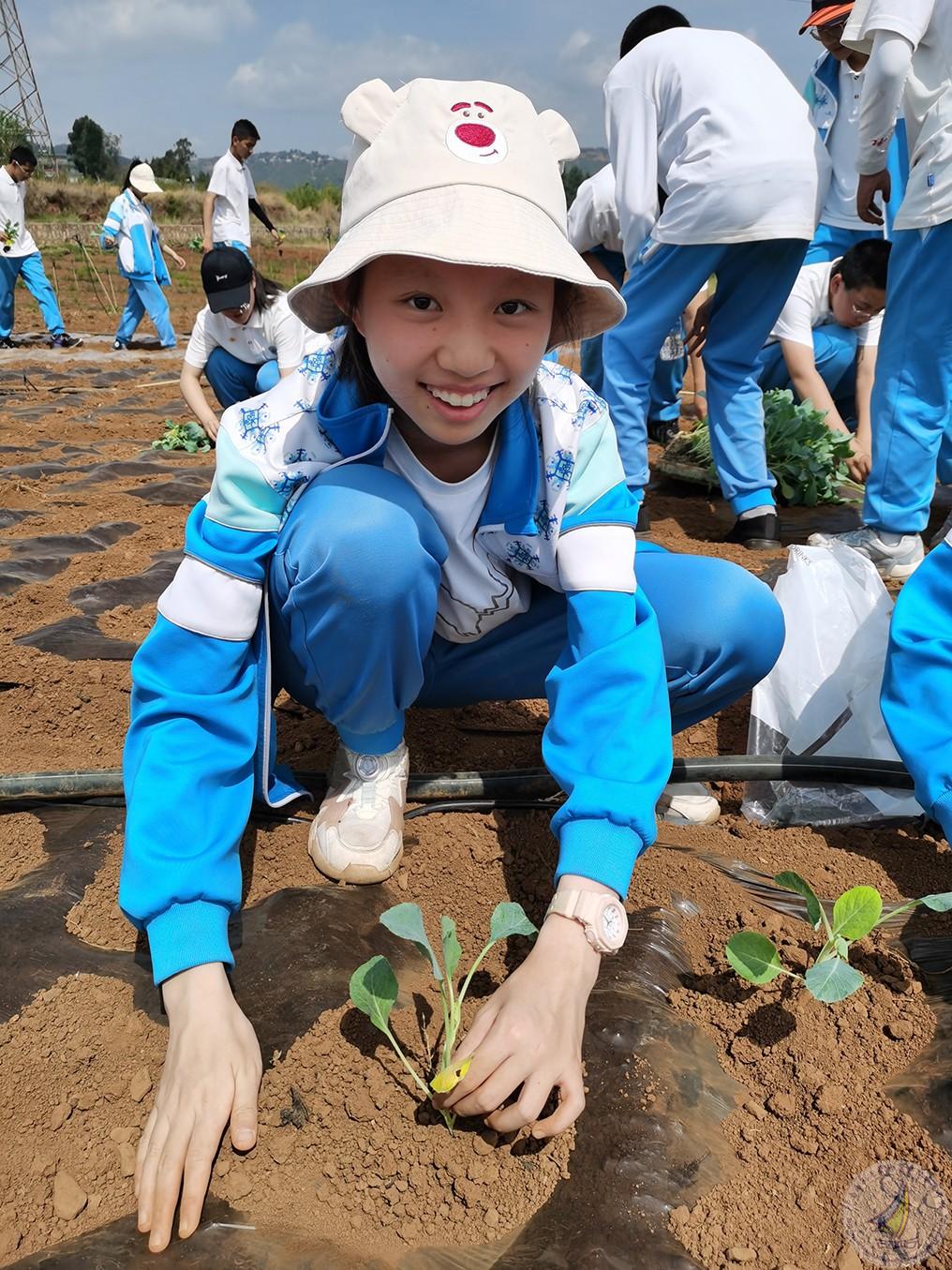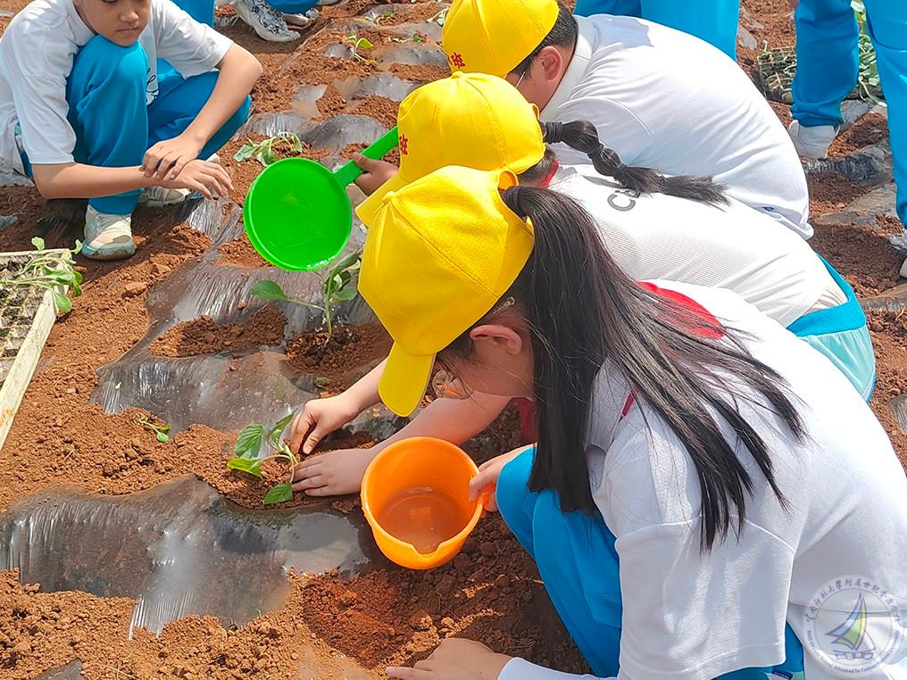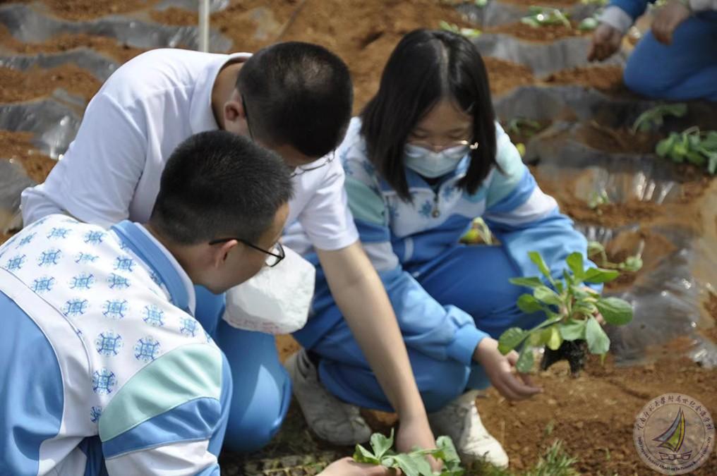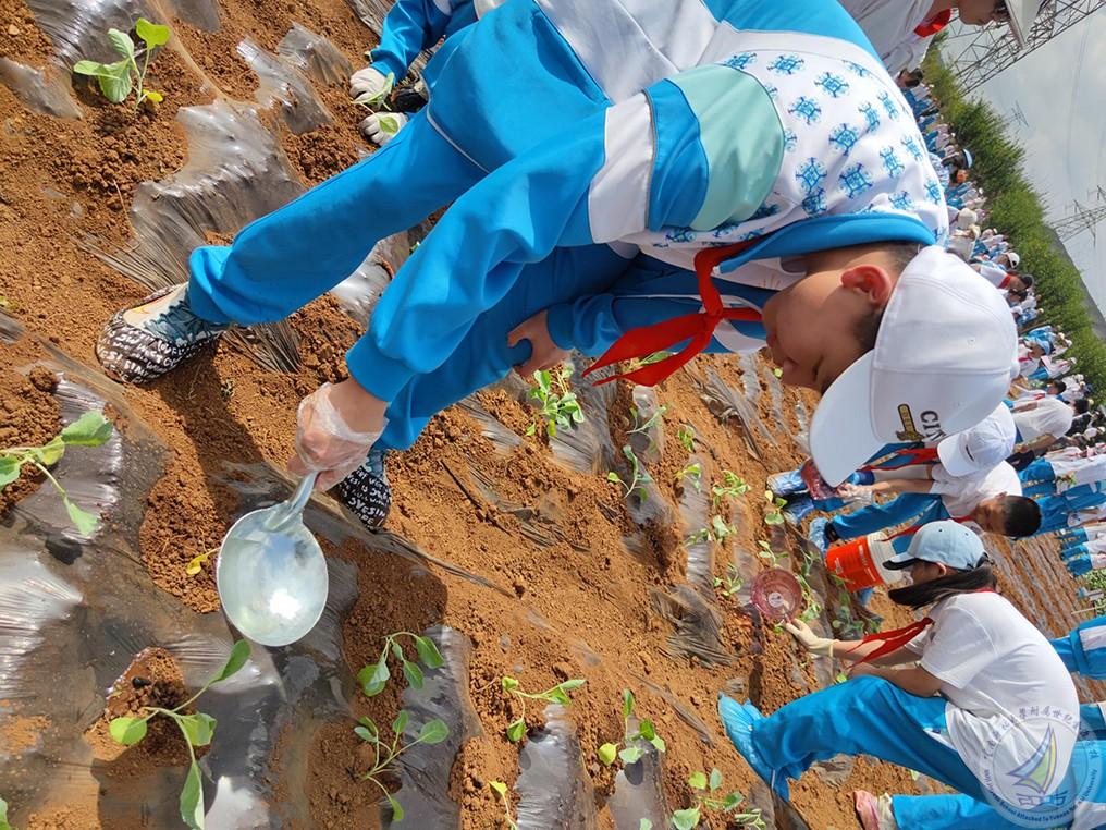 第二个项目就是全体学生种植莲花白秧苗,每个学生亲自体验从取苗、用手撑开薄膜、把苗栽到薄膜下面的土里、再到给秧苗盖上土后浇水这一完整过程,学生们不怕苦、不怕累,分工明确,团结合作,热情高涨,干得热火朝天。