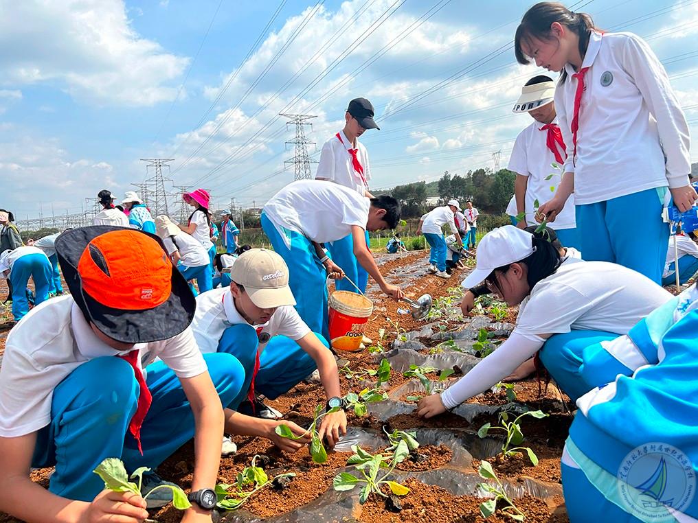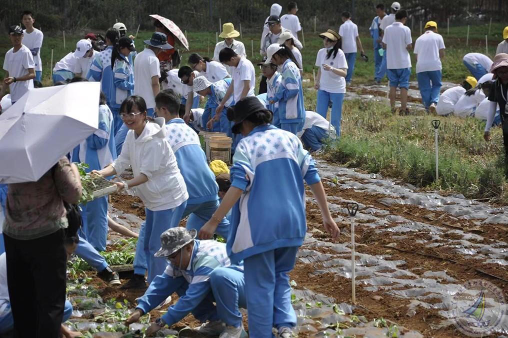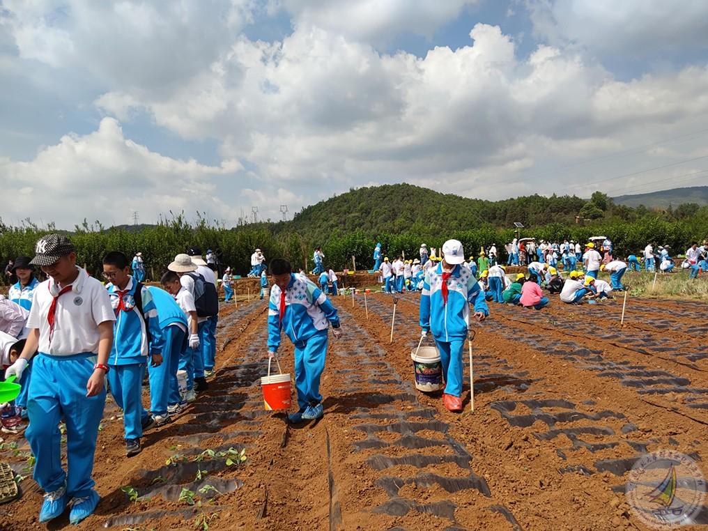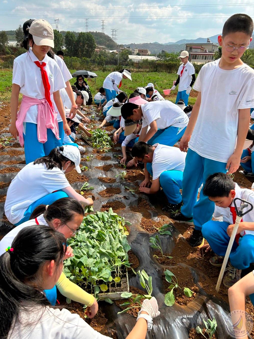 第二个项目就是全体学生种植莲花白秧苗,每个学生亲自体验从取苗、用手撑开薄膜、把苗栽到薄膜下面的土里、再到给秧苗盖上土后浇水这一完整过程,学生们不怕苦、不怕累,分工明确,团结合作,热情高涨,干得热火朝天。