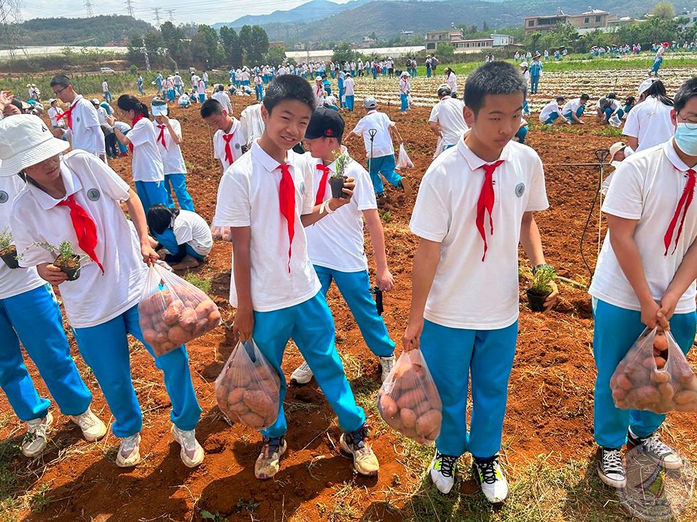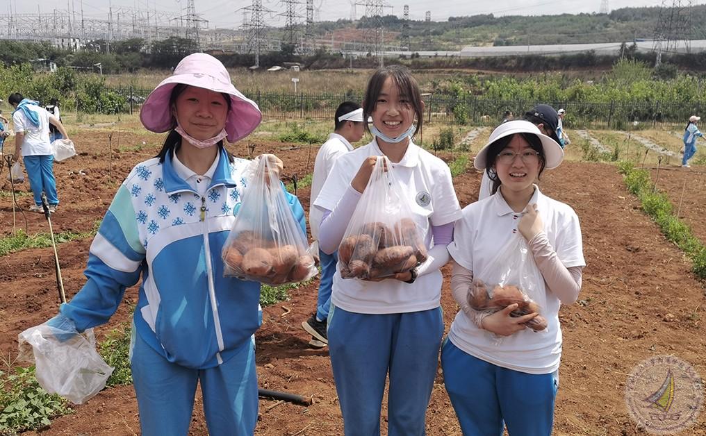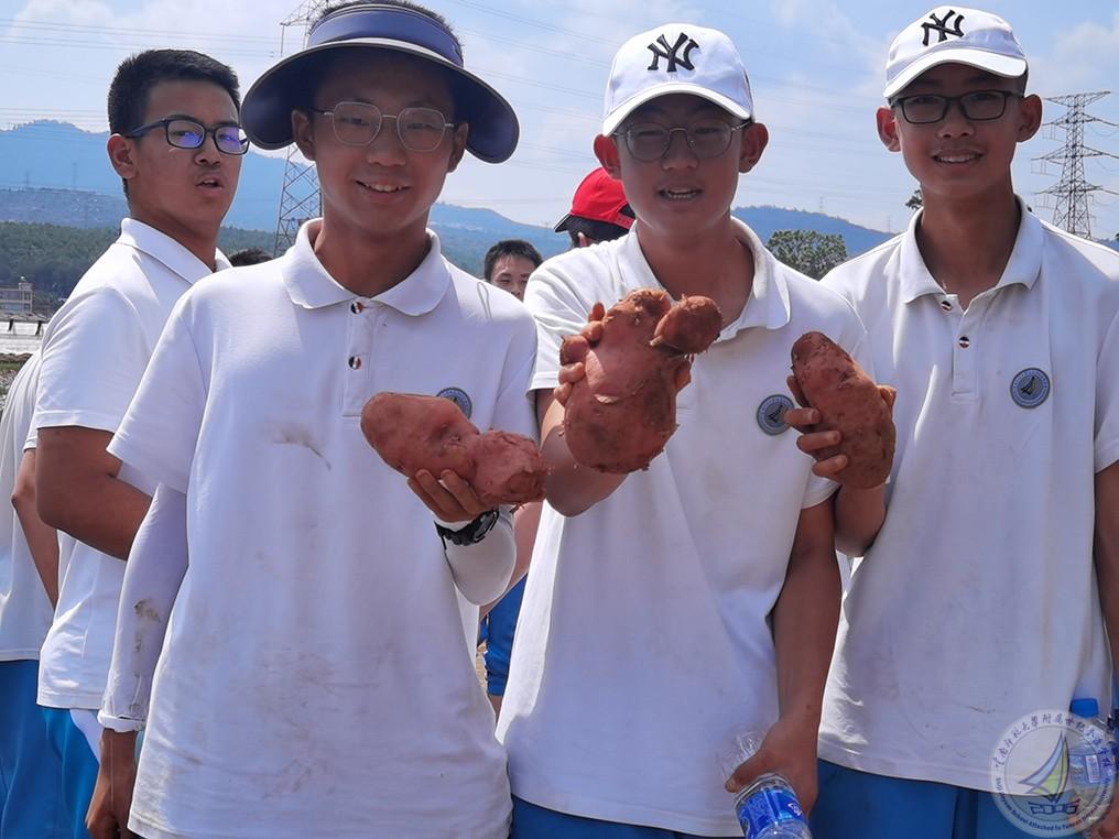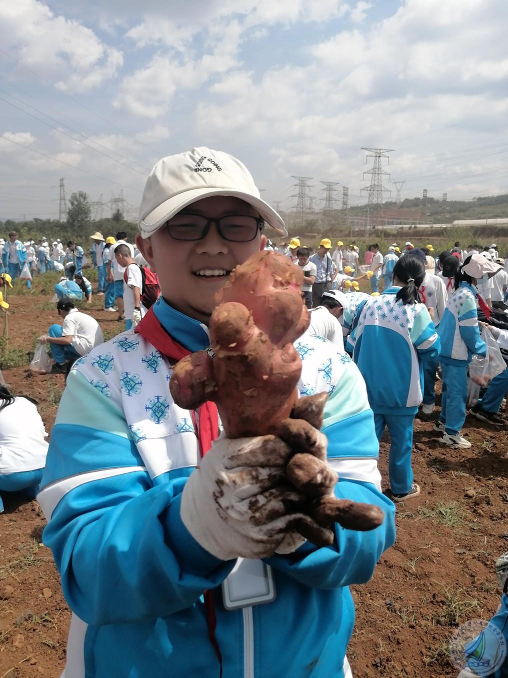 种完秧苗后紧接着就去挖土豆。同学们兴致勃勃,埋头在大大的田地里面挖呀挖,收获了大大小小的土豆。虽然烈日炙烤,同学们大汗淋漓,但收获的喜悦让孩子们笑容满面。