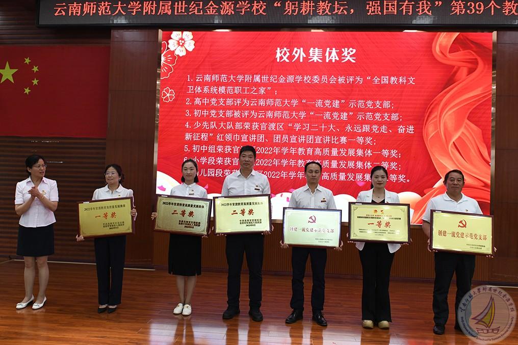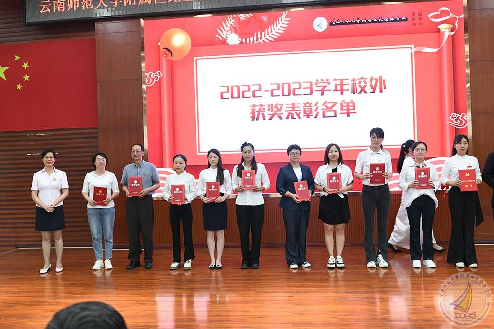 在全校师生员工的共同努力下,我校2022-2023学年荣获“全国教科文卫体系统模范职工之家”、“云南省一级三等高(完)中”等荣誉称号;高中党支部、初中党支部分别被评为云南师范大学“一流党建”示范党支部;少先队大队部获得官渡区“喜迎二十大,奋进新征程,建功新时代”红领巾宣讲比赛一等奖;初中获得“官渡区官渡教育高质量发展集体”一等奖;小学和幼儿园分别获得“官渡区官渡教育高质量发展集体”二等奖;代锦春老师获得“云南省优秀教师”表彰,10位教师分别获得“官渡区官渡教育高质量发展”先进个人;一批优秀教师被评为省市区级教学名师、学科带头人、骨干教师、教坛新秀等荣誉称号。
