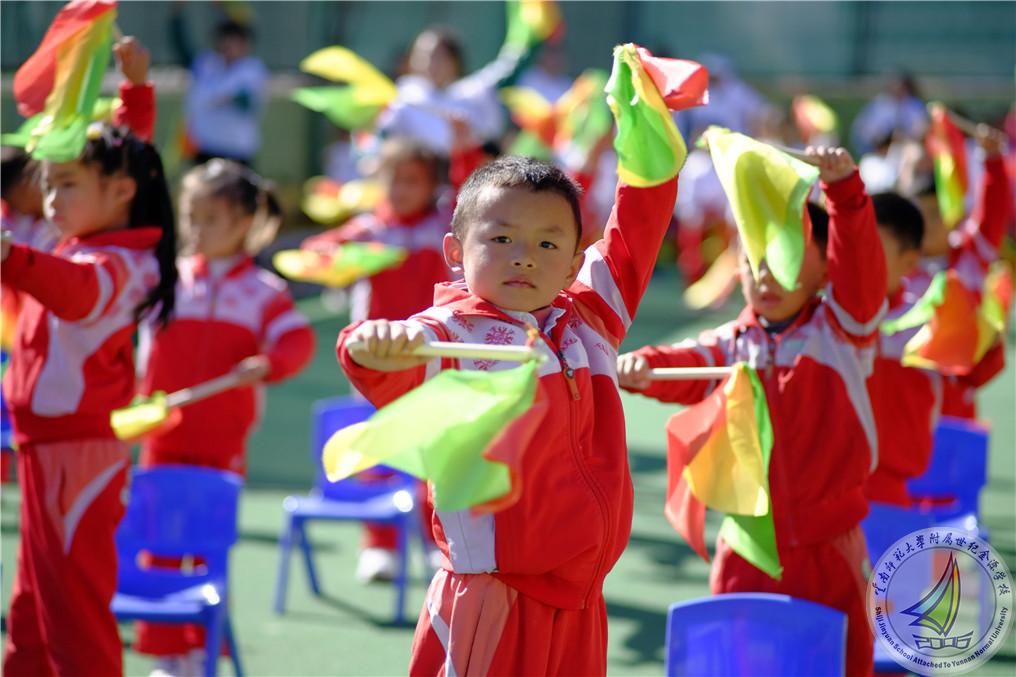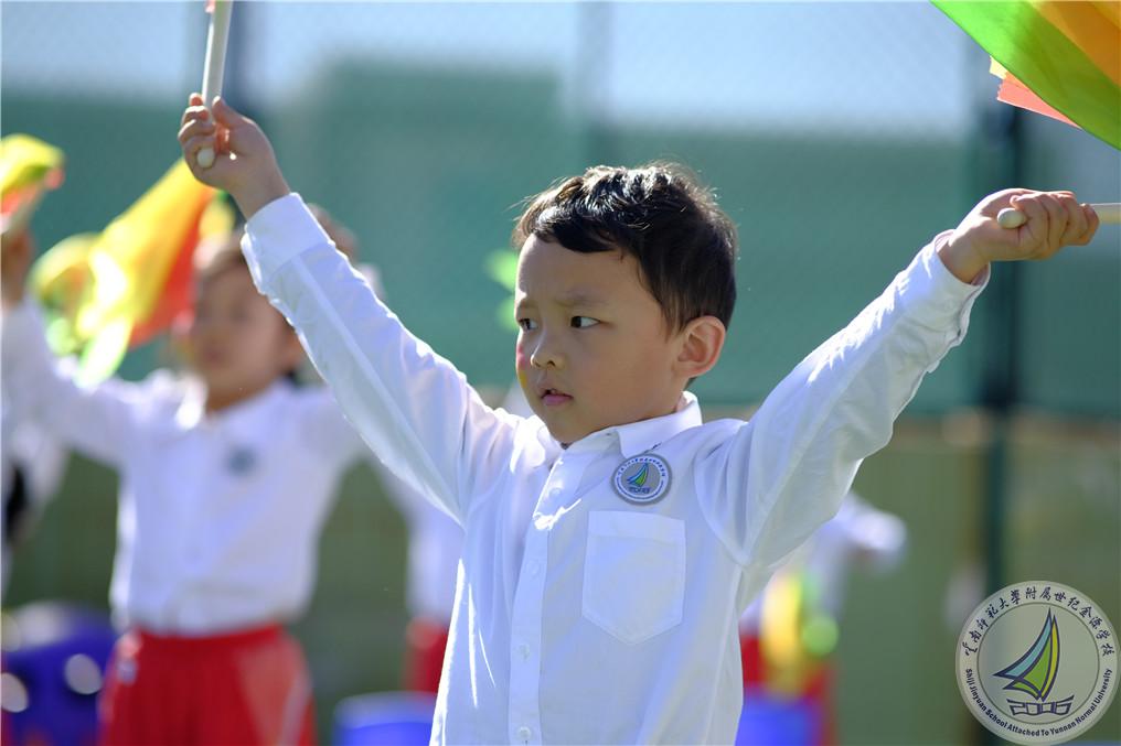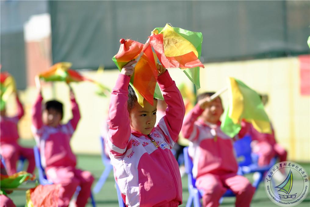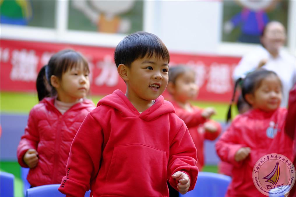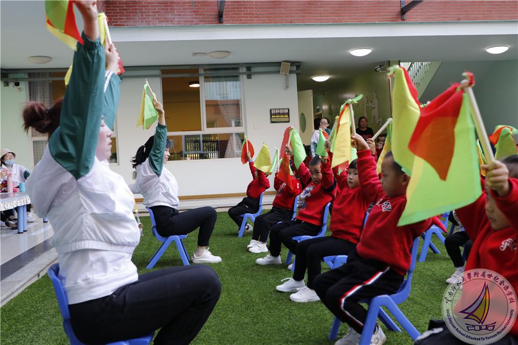最后出场的是小班的宝贝们,小班的宝贝们个个活泼可爱,他们虽然年龄较小,但是每个人都能高高地举起娇嫩的小手,和着拍子随老师一起认真挥动。