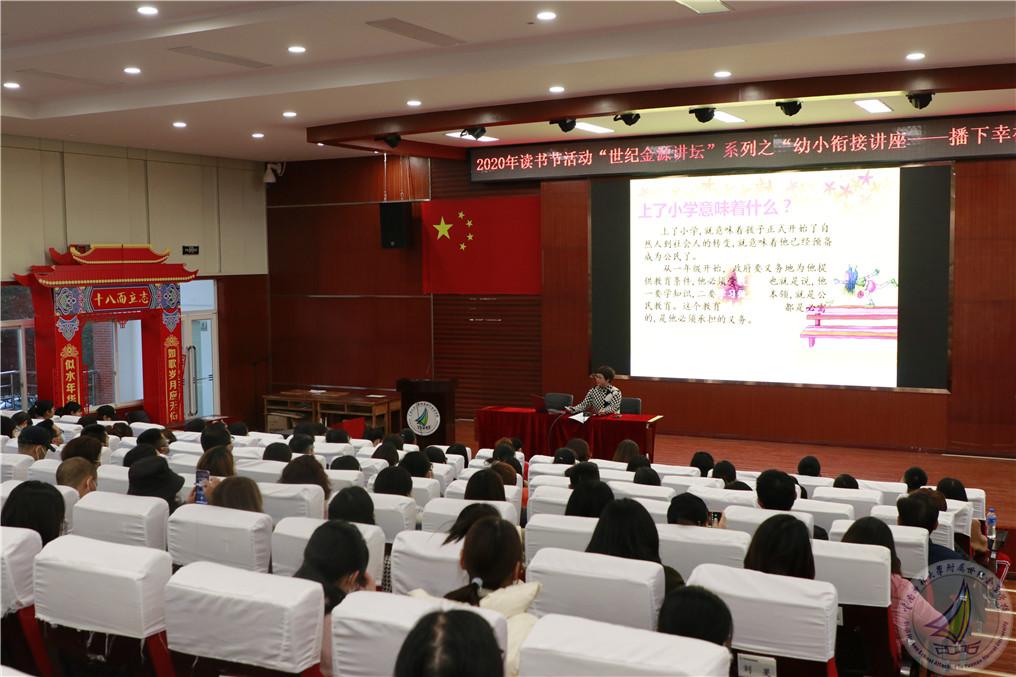 幼小衔接是幼儿园和小学教育两个教育阶段的平稳过渡的教育过程,也是儿童成长过程的一个重大转折。结合本次学校“读书节”活动,幼儿园于2020年12月10日下午特别邀请了我校小学部雷琳副部长在报告厅开展“世纪金源讲坛”系列活动之幼小衔接讲座暨家长学校——“播下幸福的种子”,我校渠志春副校长也亲临了现场。