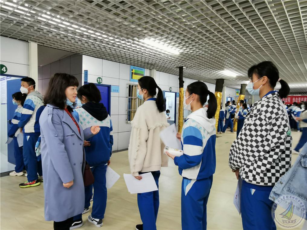 到达目的地后,初三8个班学生以班级为单位,在班主任的带领下排队有序地进行一项一项的检查。在体检的过程中,有的同学见哪个体检项目人少,就先去那里体检,这样就更加省时省力了。