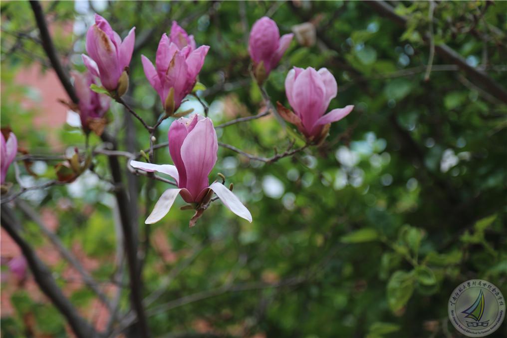 入目皆是草木嫩绿,鲜花盛开,低嗅时暗香涌动。图书馆前的树木已悄悄地发了芽,