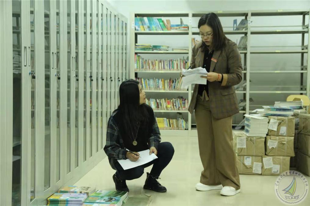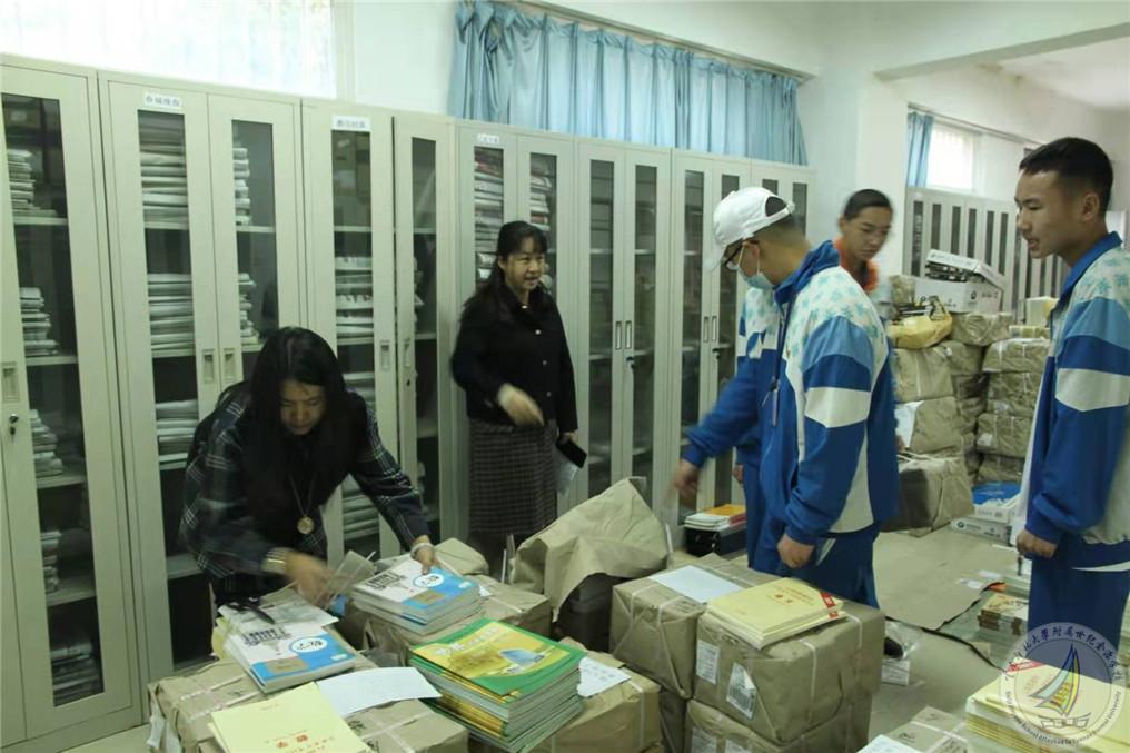 图书馆的老师们负责图书的借阅和管理,并协助教务教科中心发放新教材。2月28日,信息宣传中心梁俊主任和图书馆郭婷婷老师、周艳老师、张淑老师一起清点好教材,按年级和班级分好。