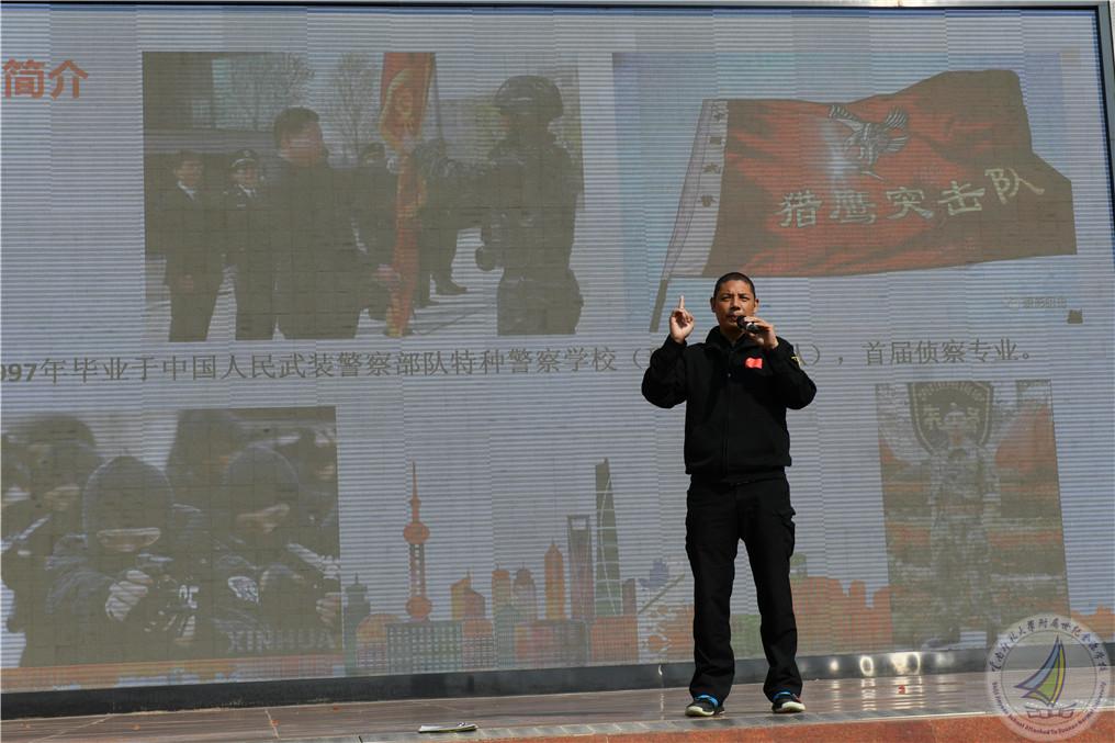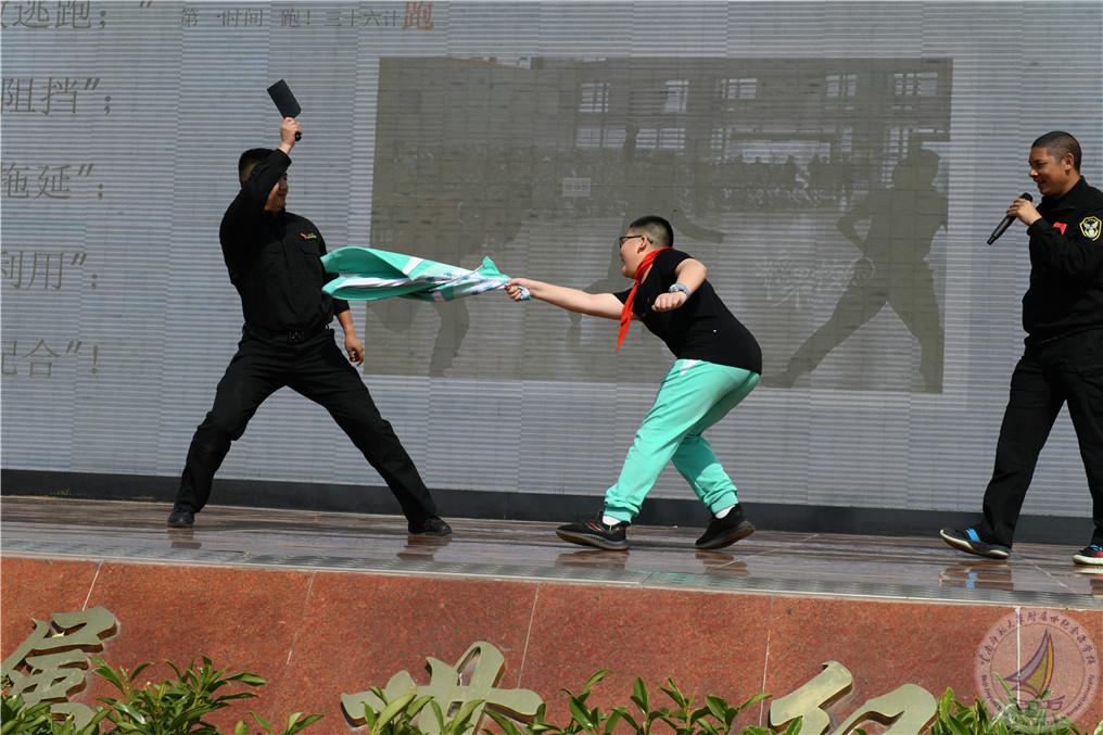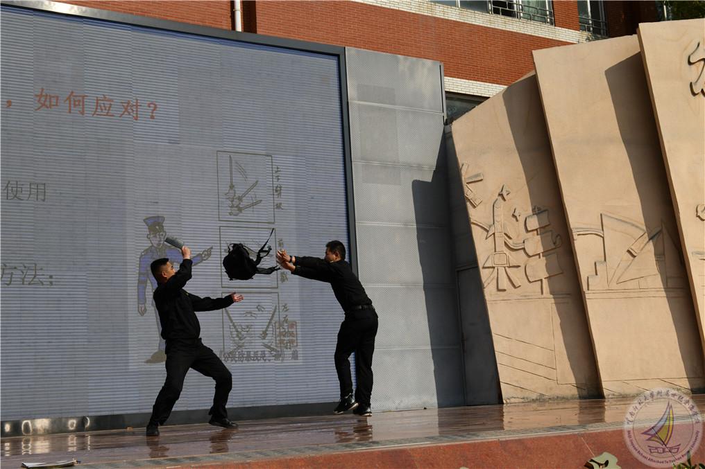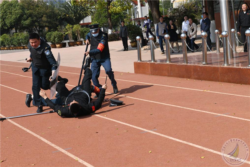 随后演练活动进入到最高潮,由云南省校园安全协会防暴恐工作委员会秘书长朱新衡警官为全体师生进行个人安全知识培训。朱秘书长以校园恶性伤害事件案例分析入手,从遇到抢劫被劫持、被爆炸,枪击、被绑架、被砍杀刺杀如何应对等四个方面,以现场理论讲解、动作示范和体验练习的方式为同学们进行了全方位讲授。演练过程中,学校保安人员与公安出警队员紧密配合,现场模拟了“歹徒”利用刀斧砍杀等情景下的防暴恐实战演练,抓捕“歹徒”、救护受伤人员等惊险刺激的环节,让师生们对暴恐事件发生的应对处置有了真切的感受。
