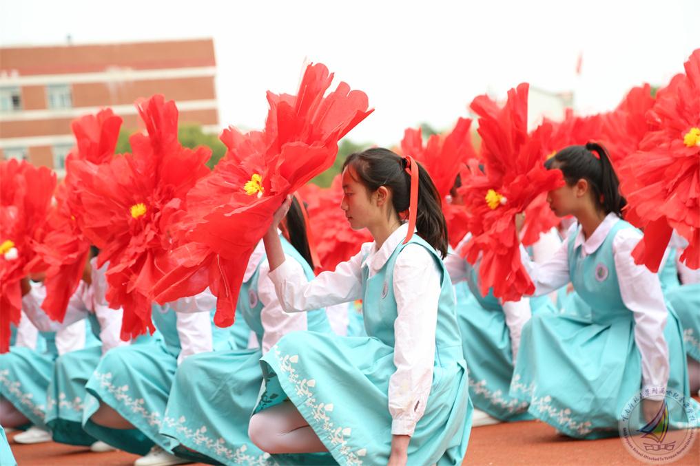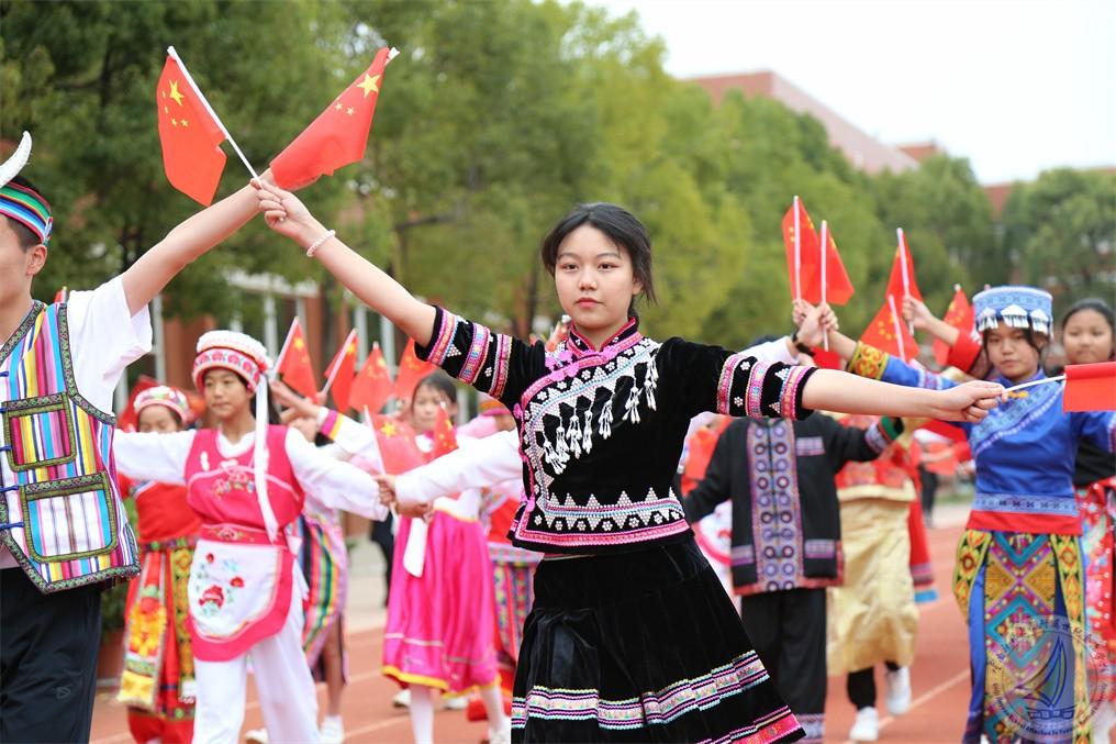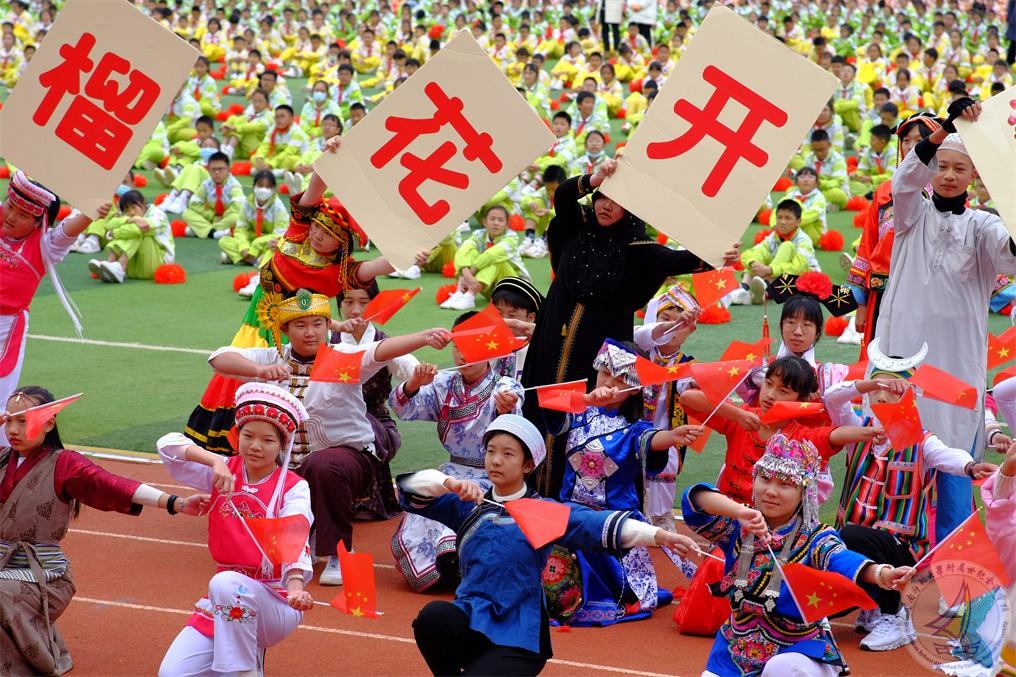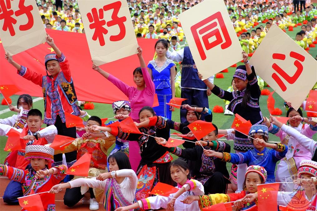 中学段的少数民族学生组成民族方阵,献礼《石榴花开籽籽同心》,初心映在红旗中,各民族的少年们心手相连、携手共舞,舞出中华民族一家亲!