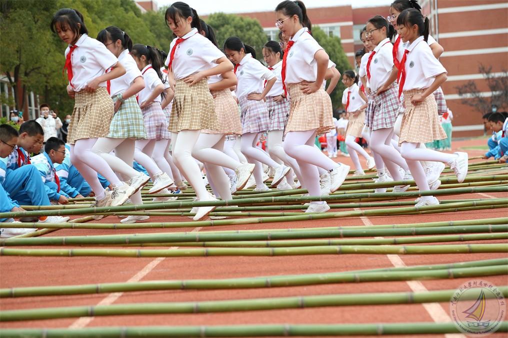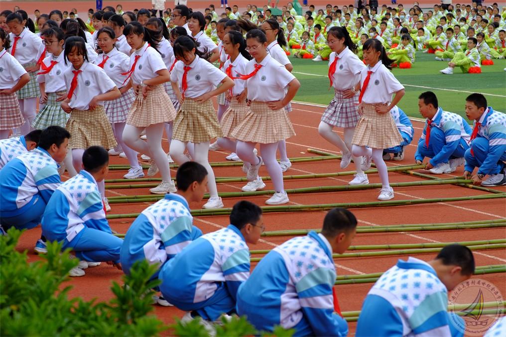 初一年级的金源少年在““开、合、开、合、开开合。”的节奏中跳出一曲民族《竹竿舞》,金源少年们将传承好民族文化,让民族团结之花常开长盛!