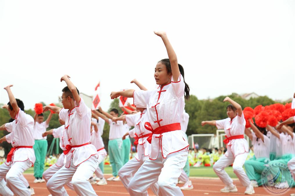 武术是中华民族传统文化的瑰宝,初二年级方阵的金源少年们如雏鹰展翅,热情奔放,似猛虎下山,虎虎生威,如凌波踏浪,又似蛟龙出水,谱写出刚柔并济,海纳百川,胸怀天地的中华武术魂!
