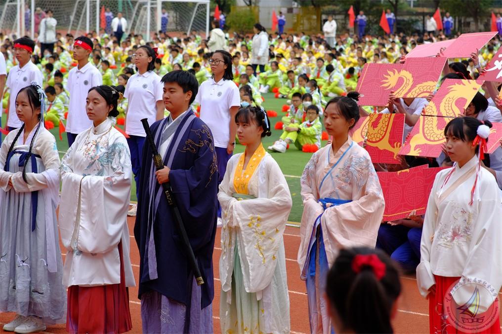 高三年级方阵的金源少年身着各朝代传统服饰,他们以青春的名义诠释中国文化的博大精深。以“龙”元素表达他们勇于创新,锐意进取之精神。