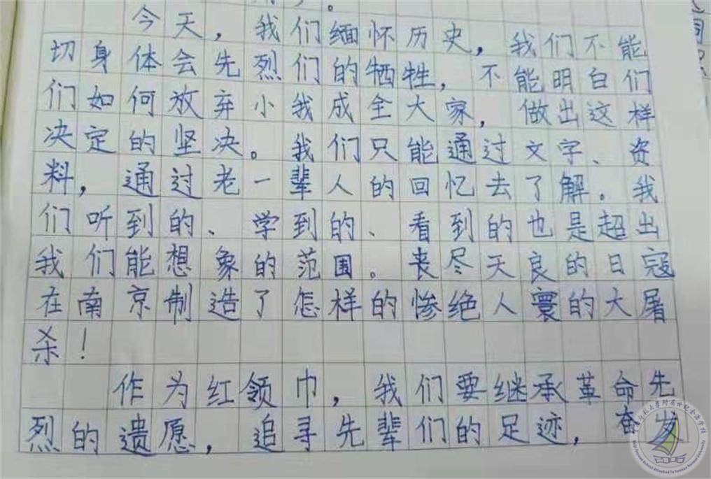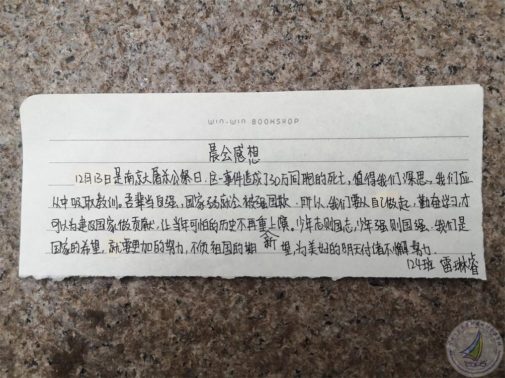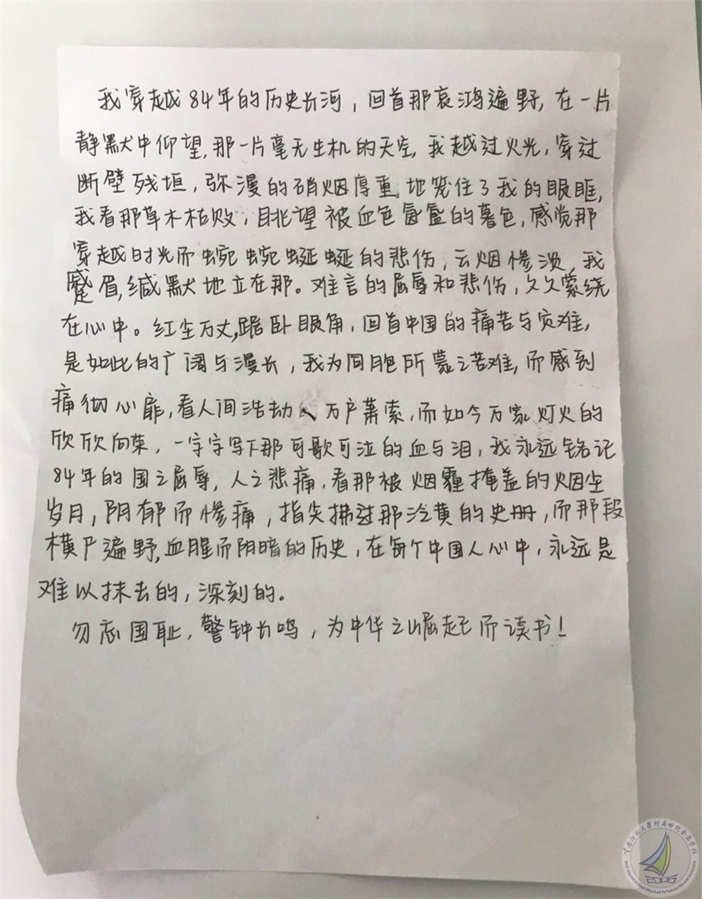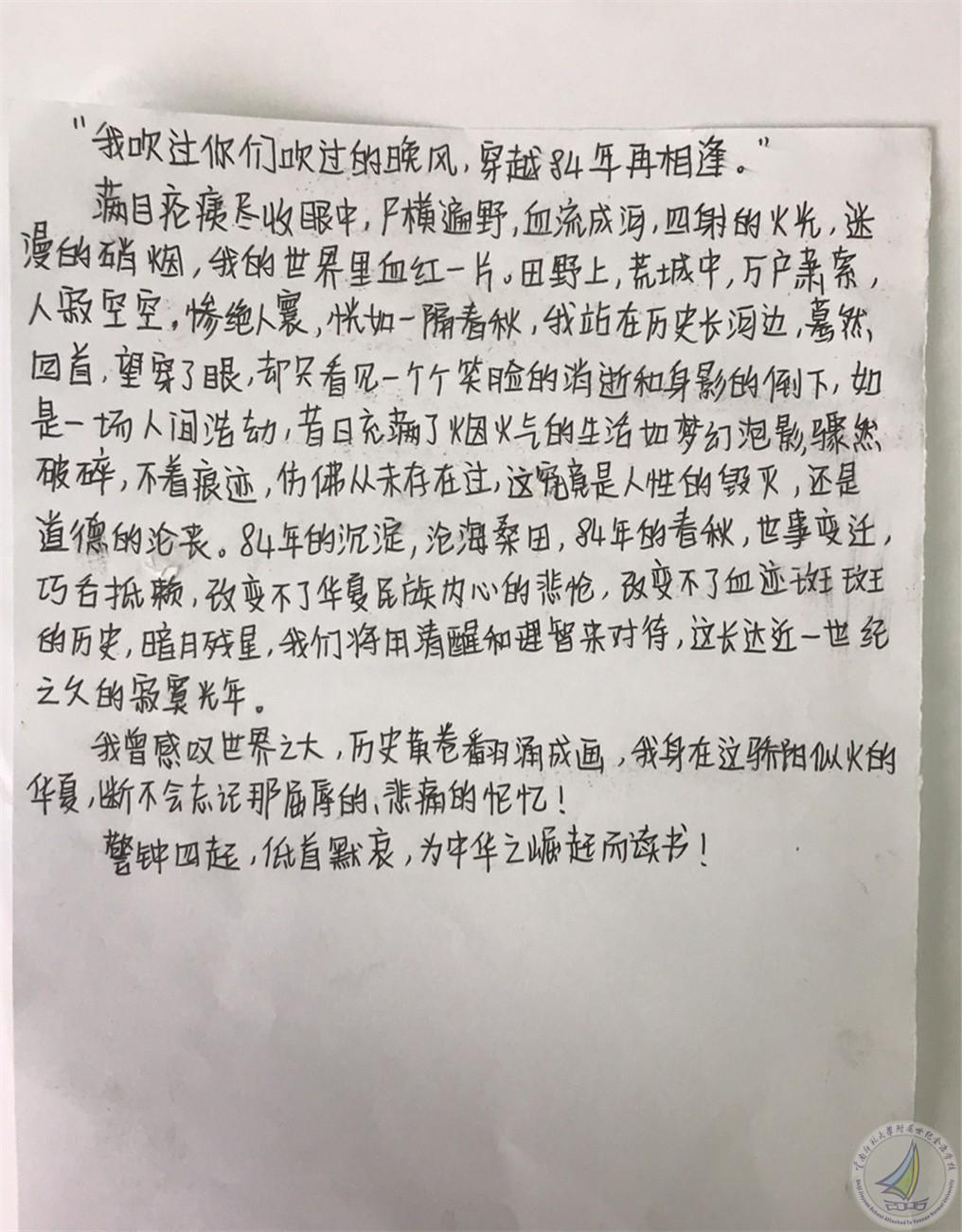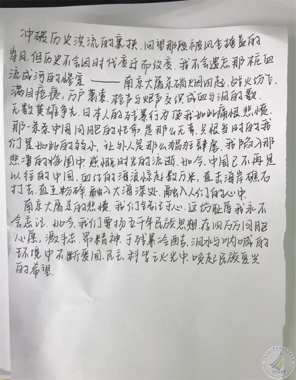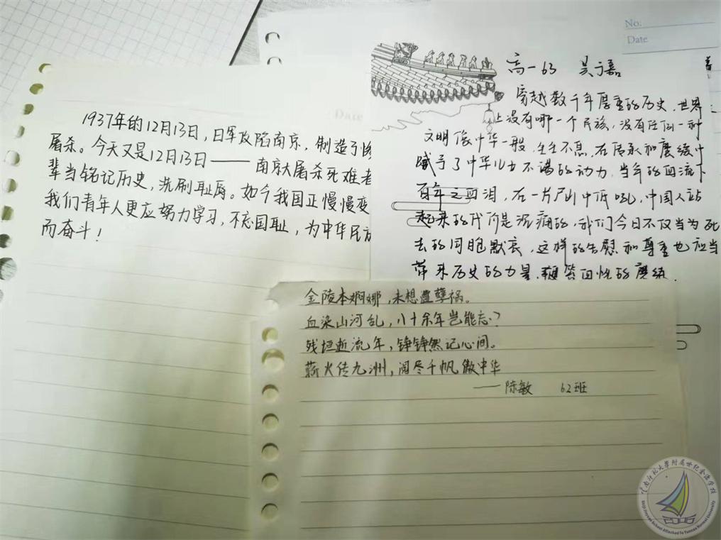 历史老师说,84年前,我们的30万同胞惨遭杀戮,一个个有梦想的鲜活生命都在屠杀中瞬间陨灭,这对中国人而言,是不可抹去的创伤记忆。历史不可忘,吾辈当自强!