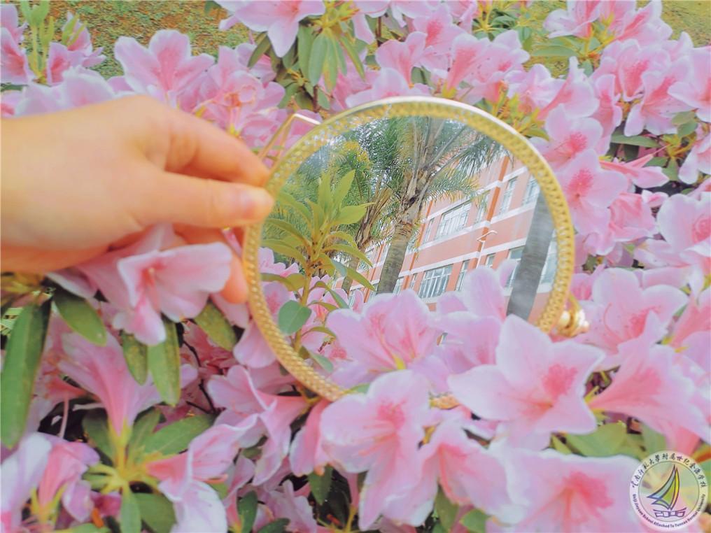 此时的校园,龙爪槐吐出嫩芽,杜鹃花盛笑恣意,深翠浅红点点朵朵,天气清澈,景物明晰,好一片暮春之清且明!