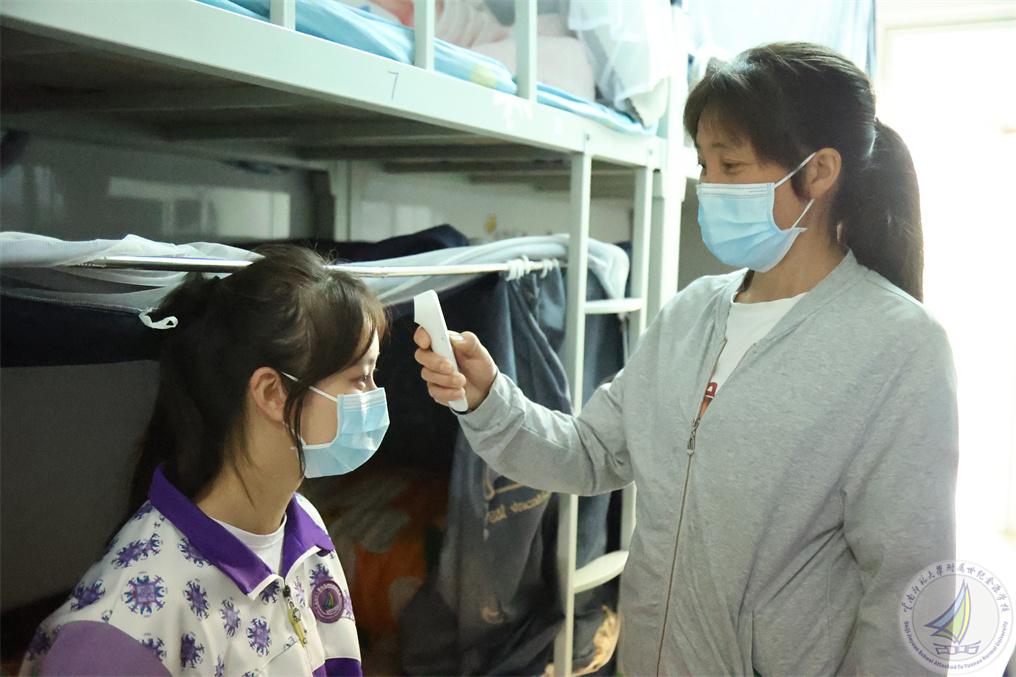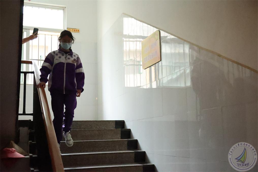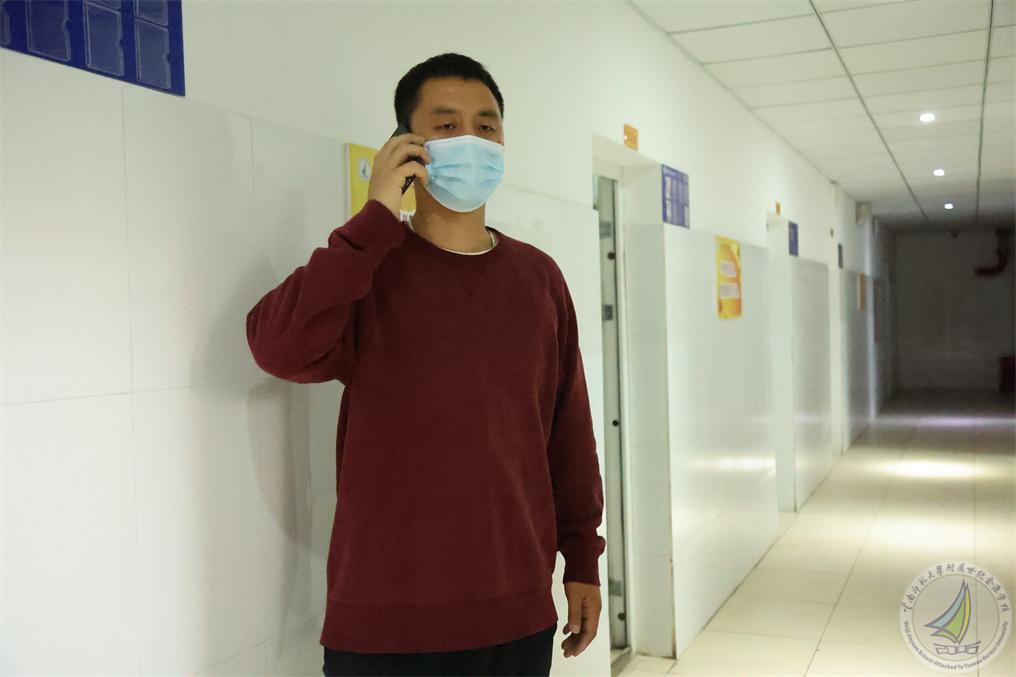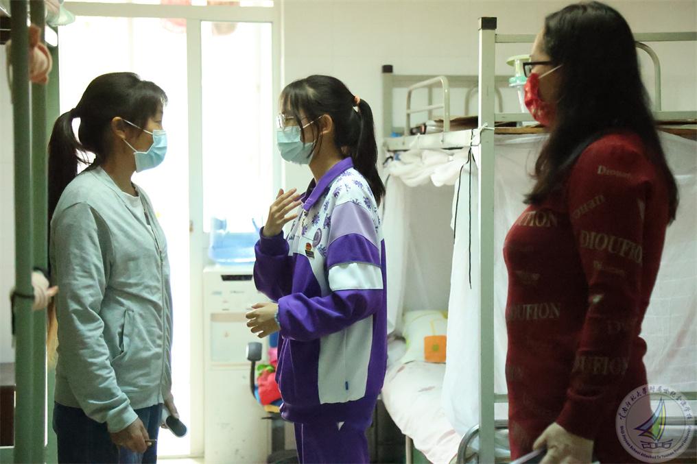 演练从午检时发现一名学生生病开始,这名学生高烧咳嗽并伴有流感症状。根据学校疫情防控网格化管理机制,宿舍安全员发现情况后立即向宿管报告,宿管接报后,立即赶往该生所在宿舍,量过体温,把这名学生转移至隔离室安置,同时上报给疫情防控二级责任人陈国栋老师,陈国栋老师立即向疫情防控一级责任人崔汝坤副校长上报。