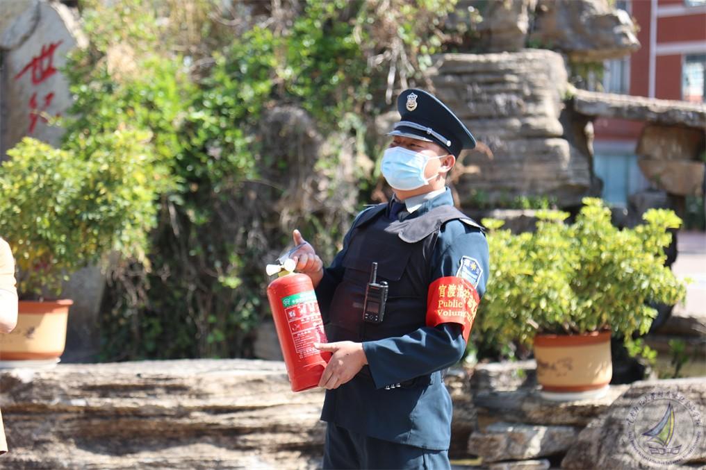 演练前,保安队长李文良为队员们讲解并示范灭火器的使用方法。