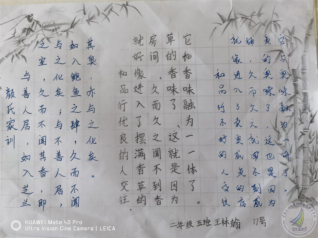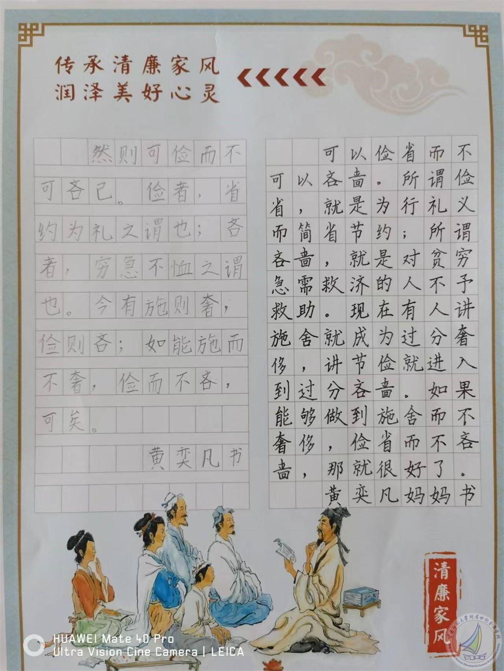 学习之后,进入第三阶段“亲子摘抄书写比赛”,有父(母)和孩子合作摘抄《颜氏家训》经典文段原文及译文, 孩子为铅笔字,父(母)为钢笔字,作品(设计)摘抄在同一张纸上,纸张自行准备,鼓励自主创意设计。