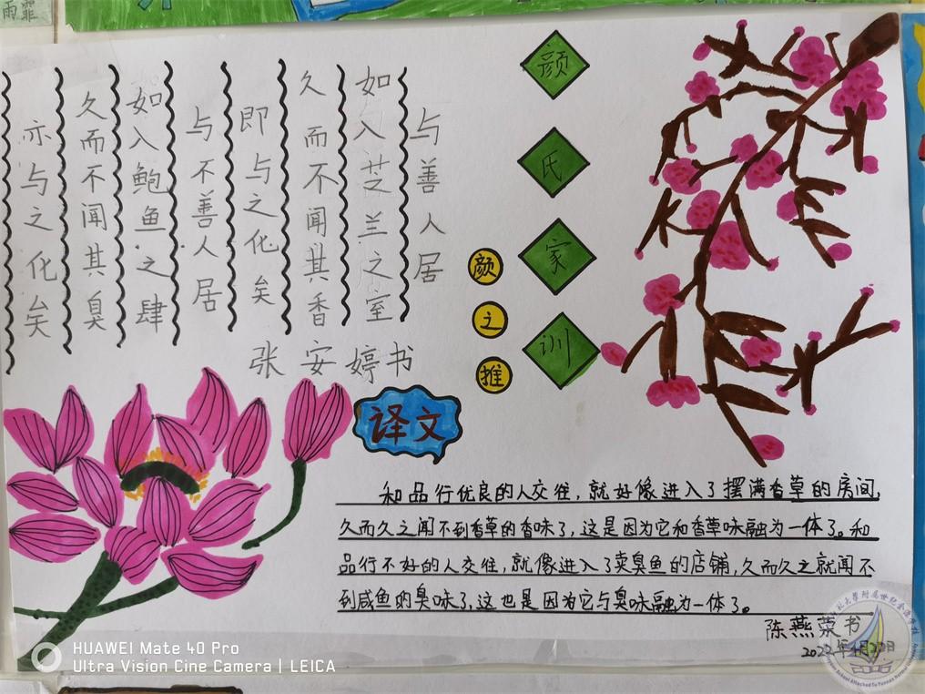学习活动的第一阶段,各班组织学生在“五·一”放假前观看相关视频资料,初步了解《颜氏家训》:颜之推是南北朝时期我国著名思想家、教育家、文学家。《颜氏家训》是他对自己一生有关立身、处世、为学经验的总结,被后人誉为家教典范,影响很大。《颜氏家训》是一部有着丰富文化内蕴的作品,它不仅在家庭伦理、道德修养方面对今天有着重要的借鉴作用。