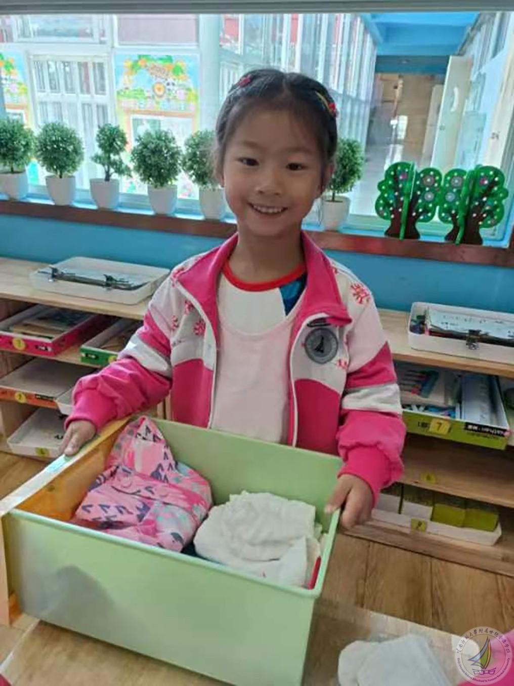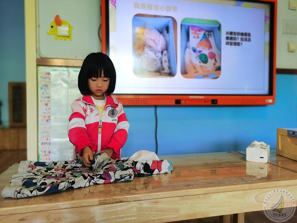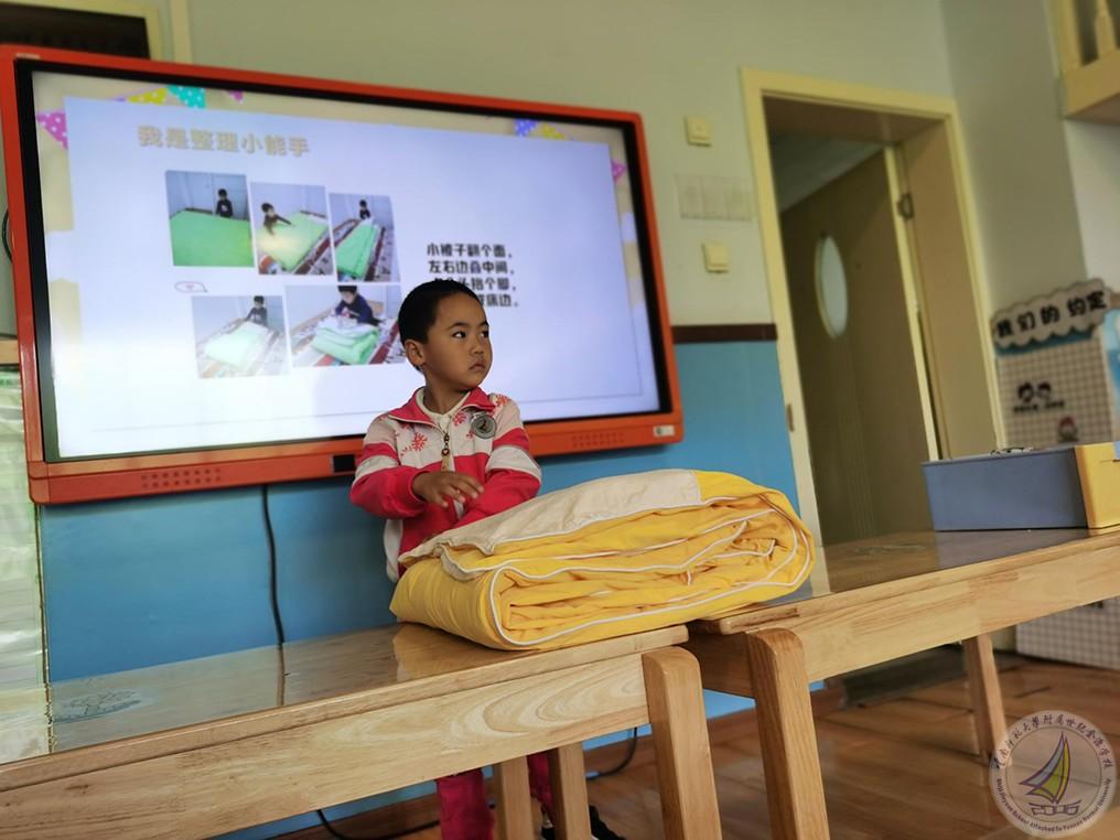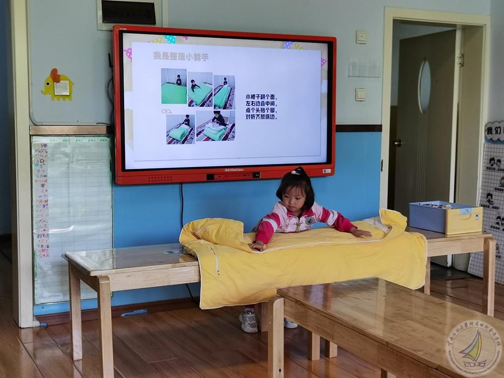 活动分为三个部分:首先,宝贝们在老师的带领下了解了抽屉的结构,并尝试整理了自己的小抽屉,之后孩子们还比赛整理了书包,为步入大班培养了良好的习惯。接下来,孩子们又学习了整理被褥、叠被子的好方法:幼儿一起边念儿歌边完成叠被子,教师们也及时指导,帮助幼儿一起整理。最后,各班针对孩子们的表现评选出“整理小能手”并颁发奖状。