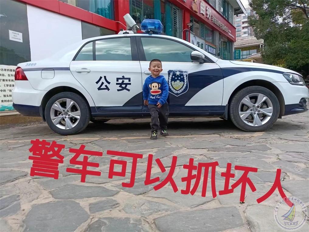昀昀:我见过警车,上面有警灯,会发出“滴嘟滴嘟”的声音。我还和最喜欢的警车合影了呢!
