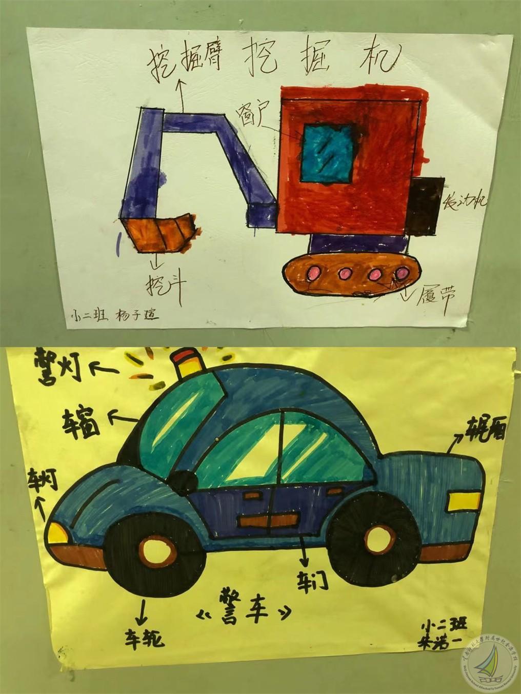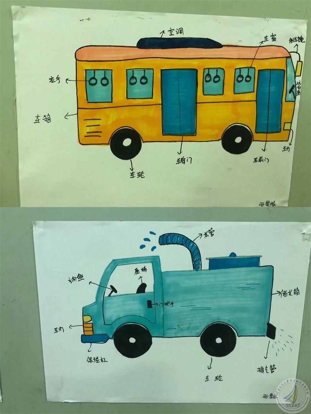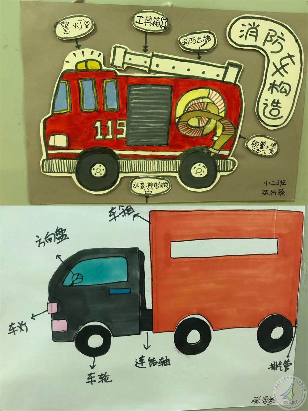 通过探究活动,孩子知道了汽车最基本的外部构造:车轮、车身、车门、车窗、车灯、方向盘、座位、排气管等。一些特殊的车还有特殊的装置,比如消防车有云梯、水箱、喷水管;货车有货箱;警车有警灯和标志......